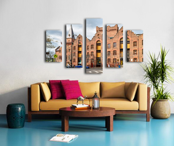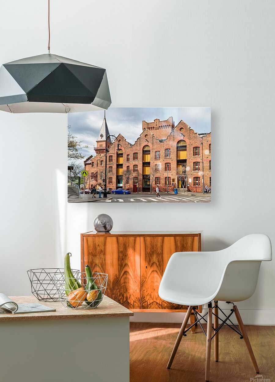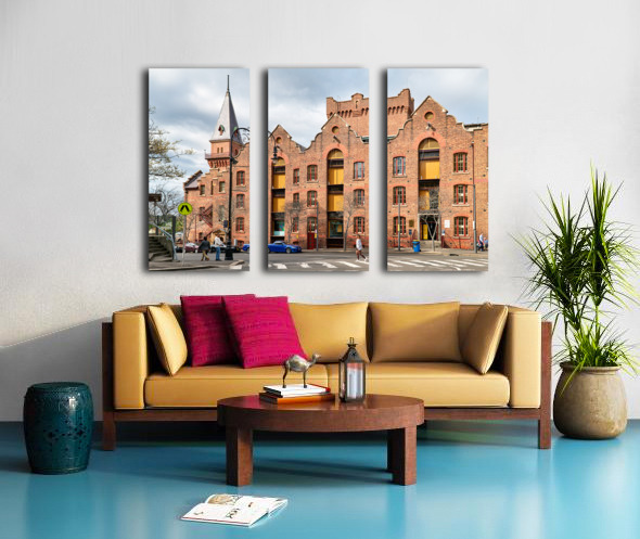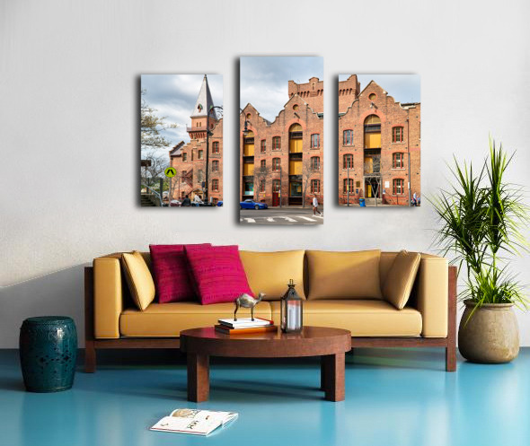 Historic brick building with a tower and people walking. Frame print