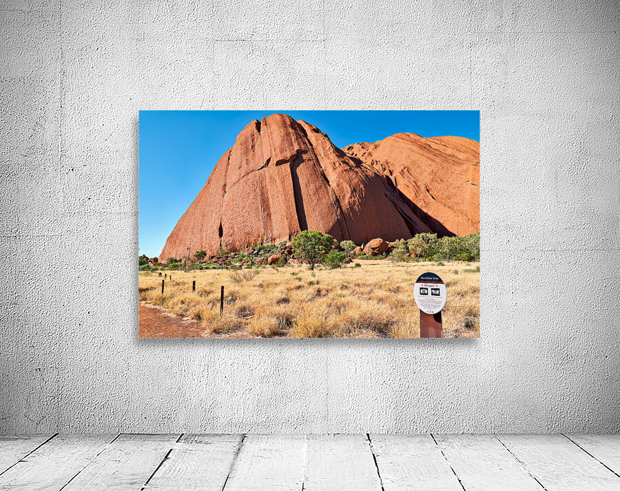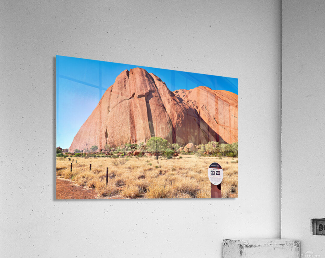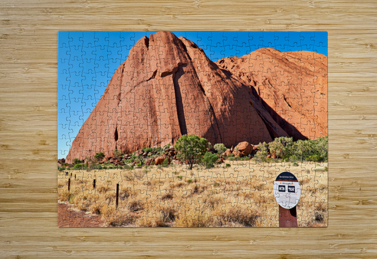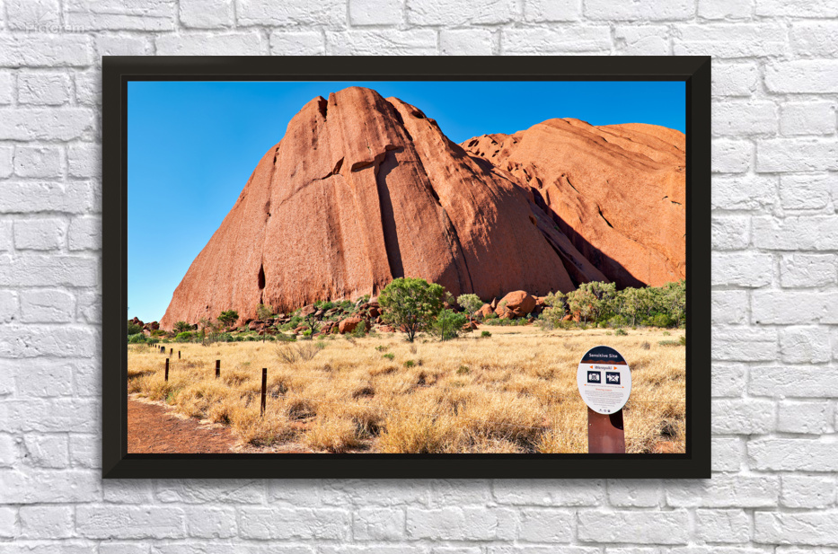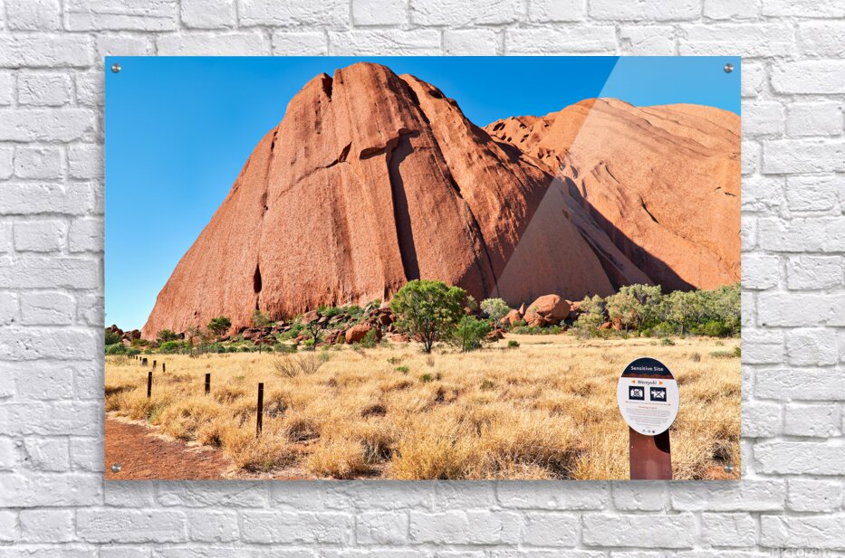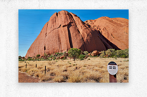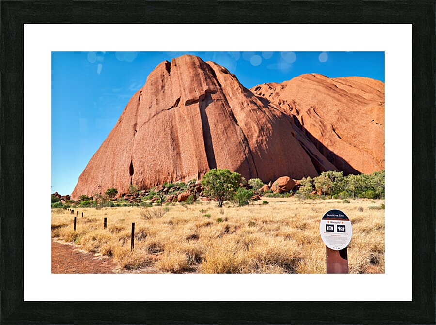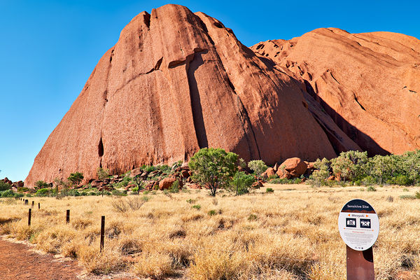 Uluru Australia. A sign indicates a sensitive site and requests no photography respecting Anangu traditions and sacred stories.