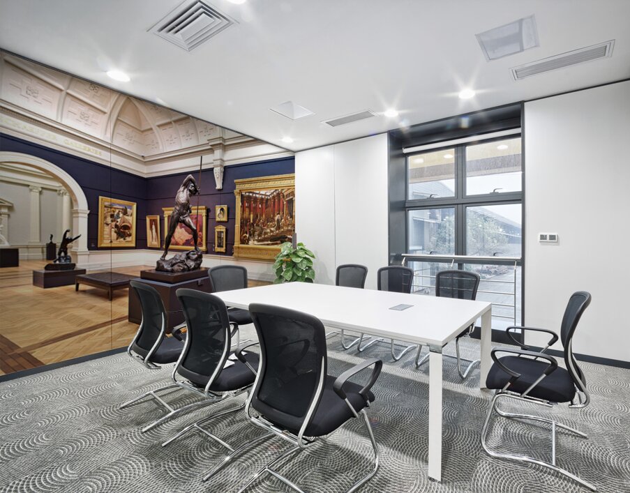 Visitors walk through the Art Gallery of New South Wales in Sydney. Sculptures and paintings are on display along the walls.