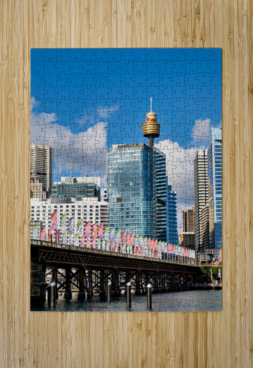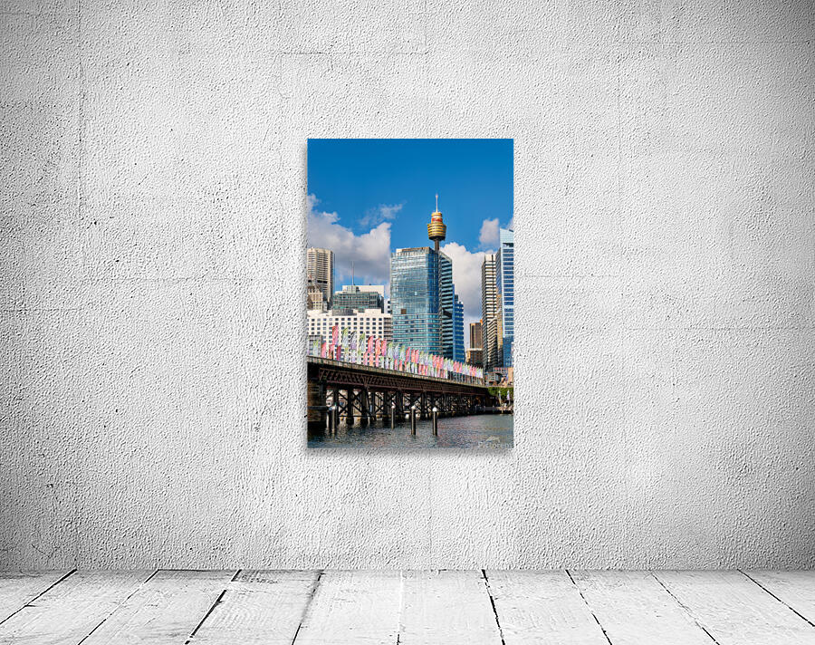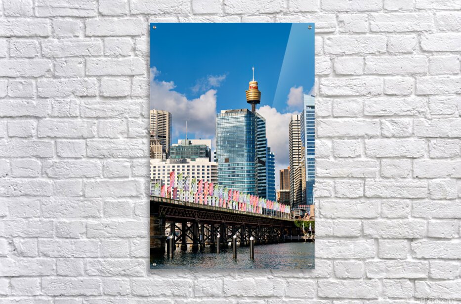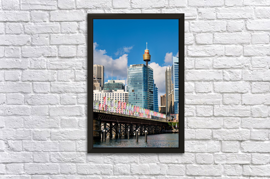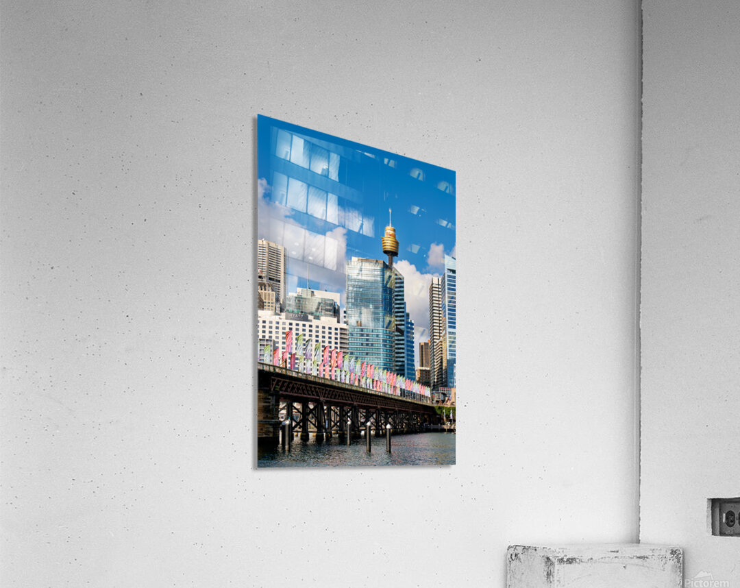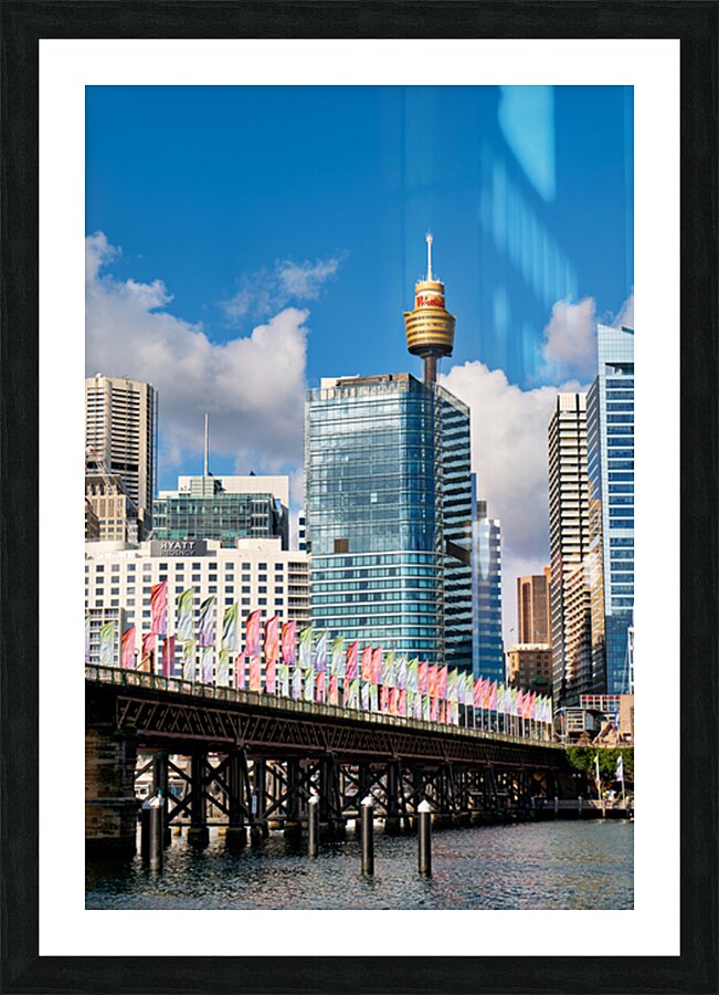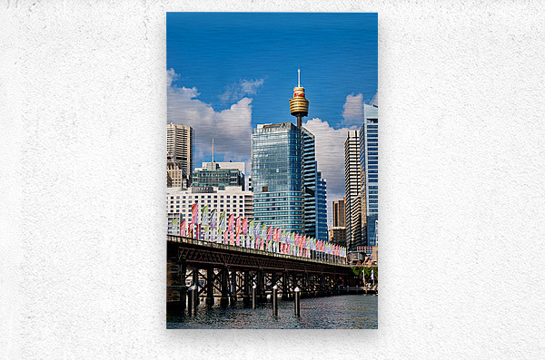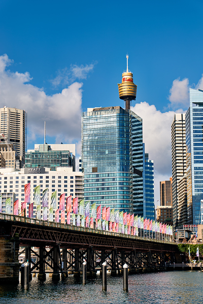 Sydney Australia - A view of the city skyline featuring the Sydney Tower Eye and modern skyscrapers with colorful flags adorning a bridge in the foreg