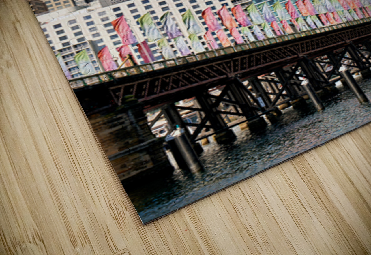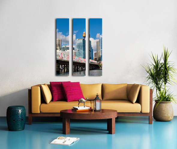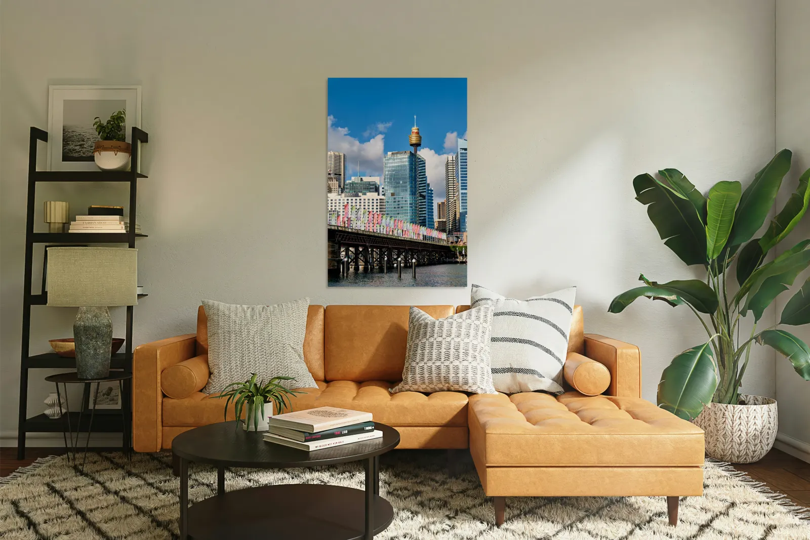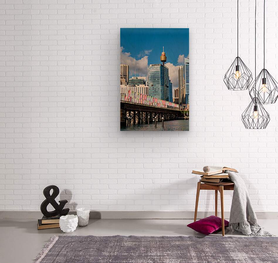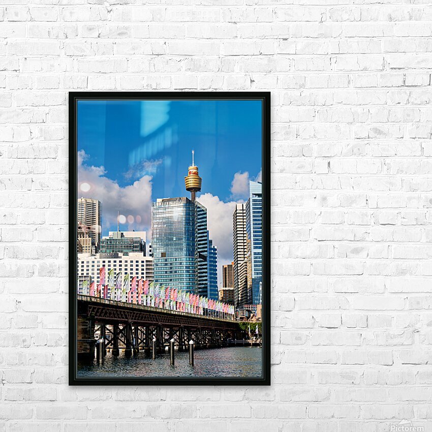 Sydney Australia - A view of the city skyline featuring the Sydney Tower Eye and modern skyscrapers with colorful flags adorning a bridge in the foreg