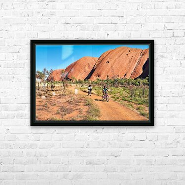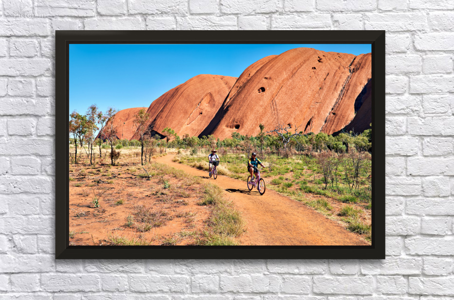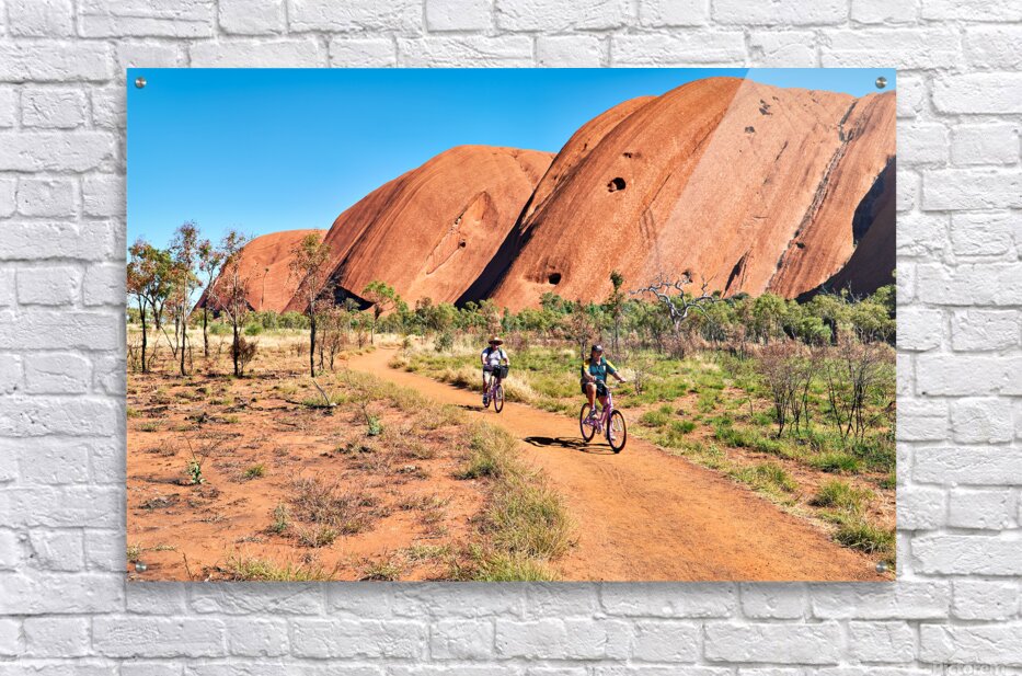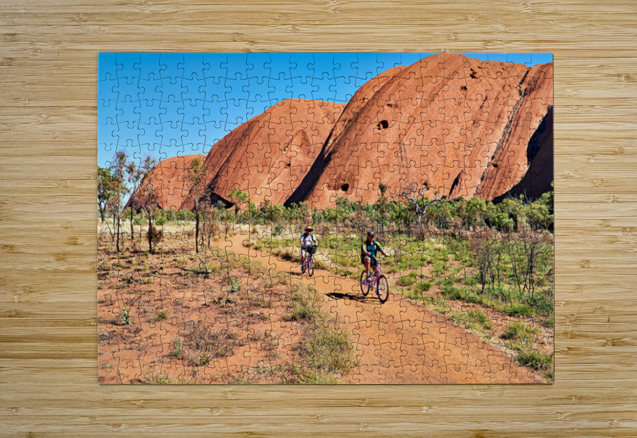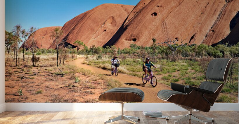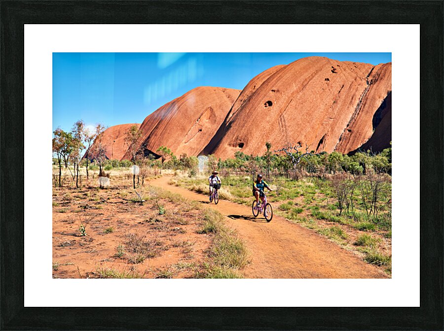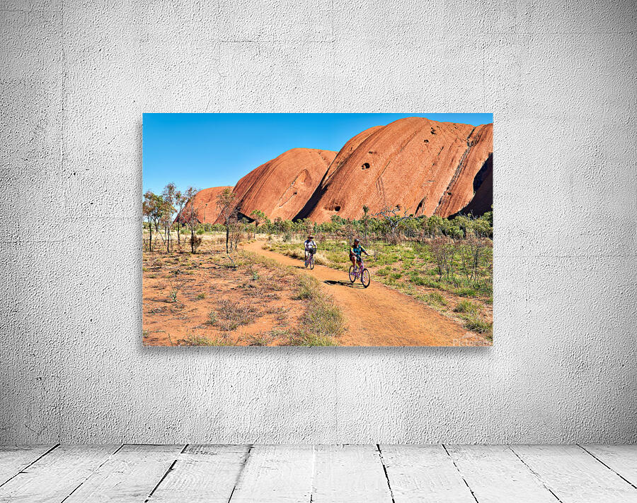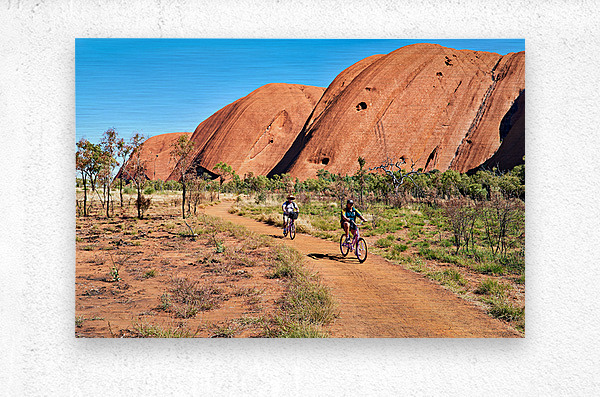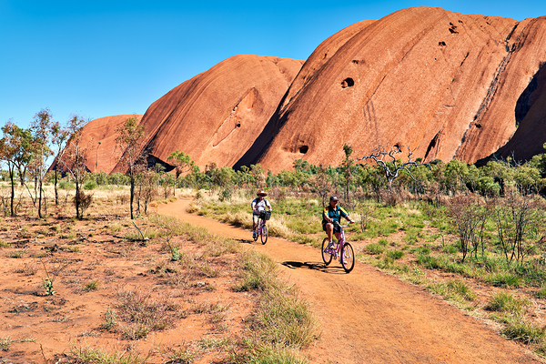 Two tourists cycle along a path near Uluru Australia enjoying the iconic landscape and clear blue sky.