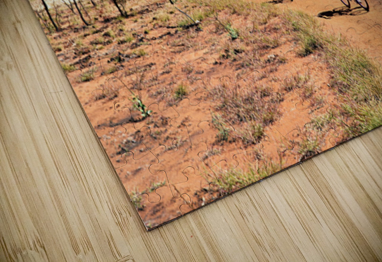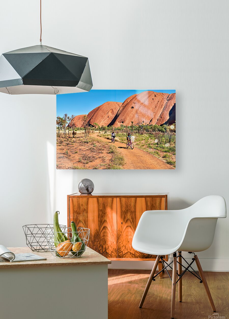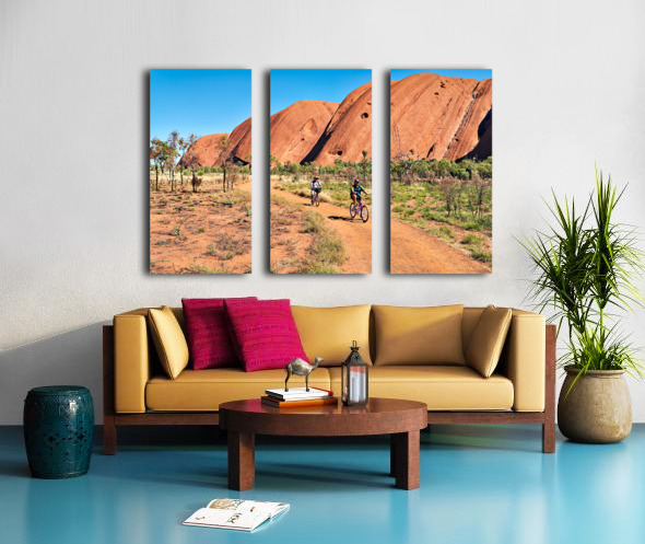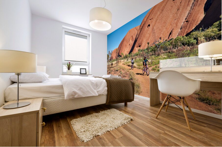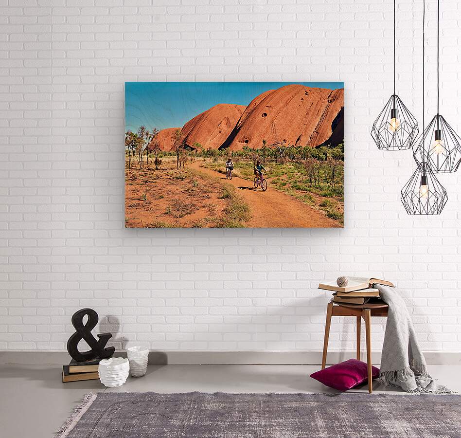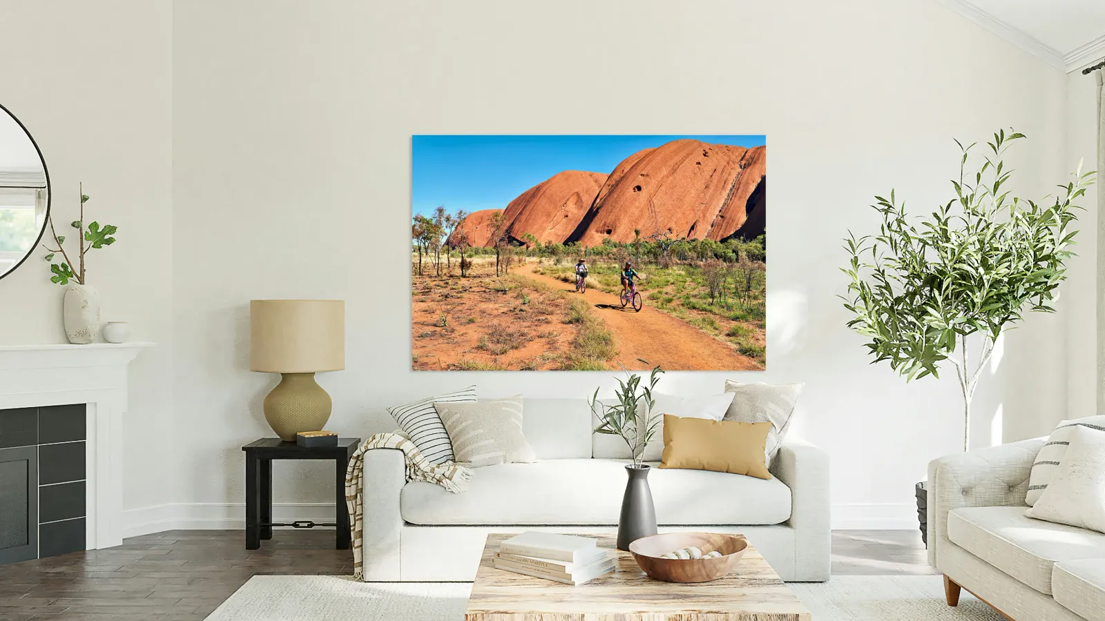 Two tourists cycle along a path near Uluru Australia enjoying the iconic landscape and clear blue sky.