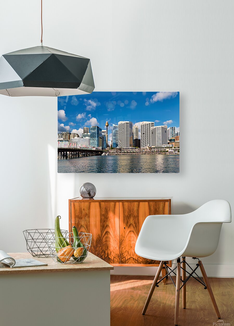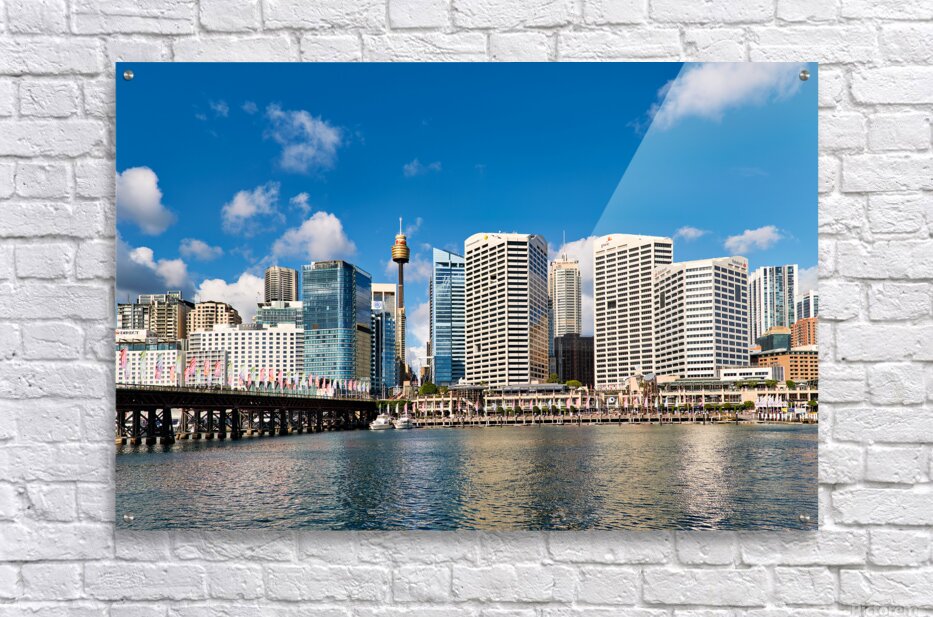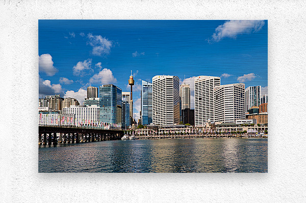 Sydney Australia - A panoramic view of Darling Harbour showcasing the city skyline with the Sydney Tower Eye and modern skyscrapers under a bright blue sky with scattered clouds.
