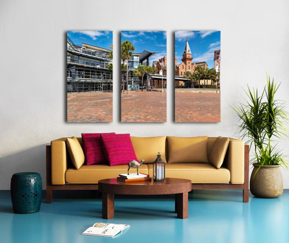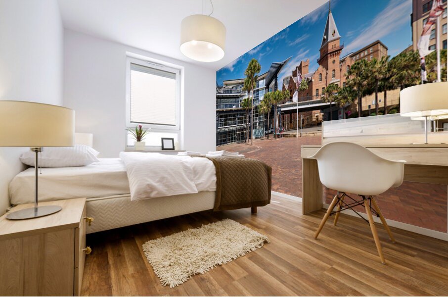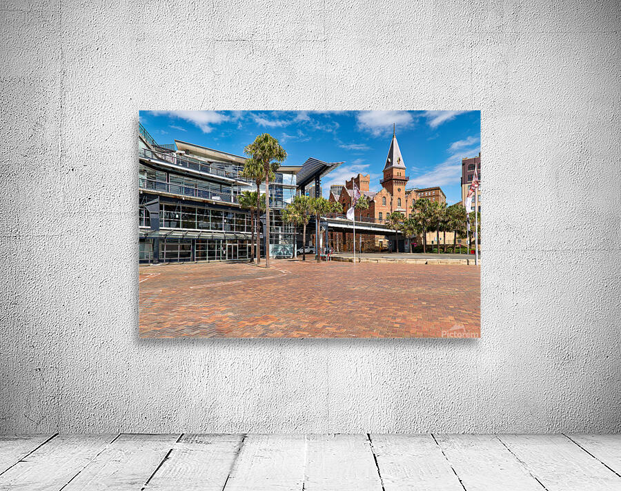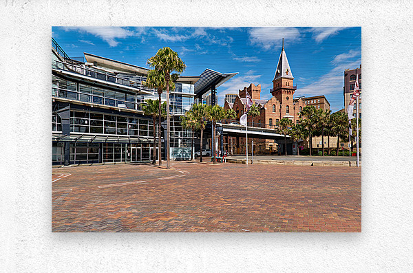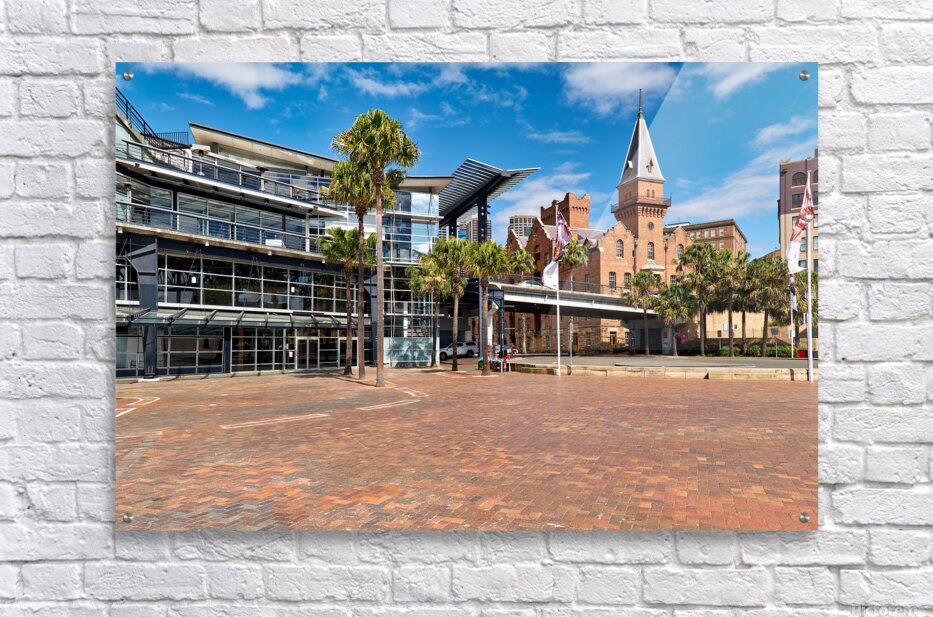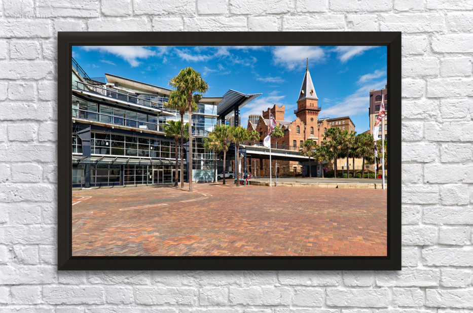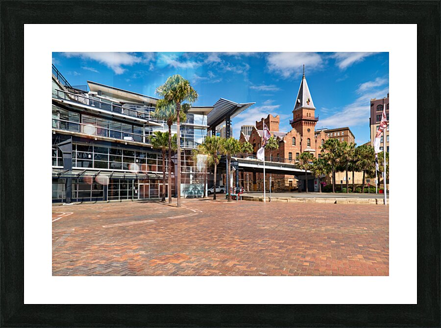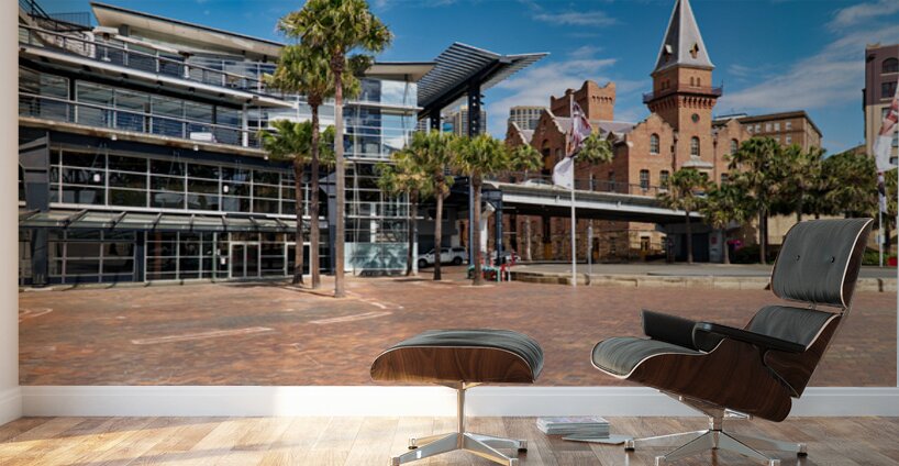 A sunny day at Darling Harbour Sydney Australia with the historic Campbells Stores building and modern architecture.