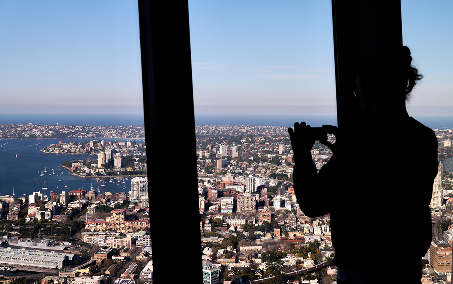 A silhouette of a person taking a photo of the Sydney skyline with their phone from a high vantage point.
