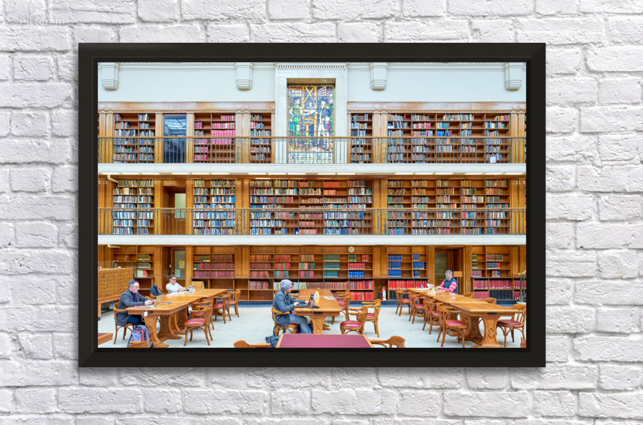 People read and study in the large Mitchell Library surrounded by shelves full of books and bright sunlight from stained glass.