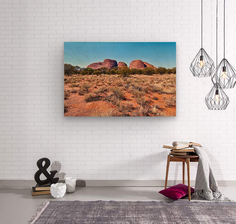 Group of large rock formations in Kata Tjuta National Park surrounded by grass and trees on a sunny day.