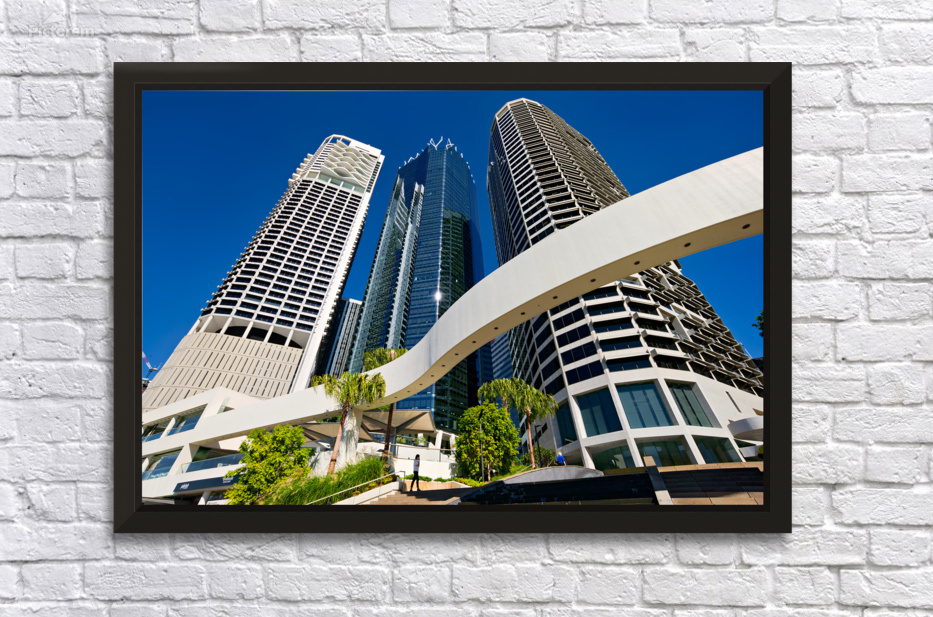 "Woman walks on stairs in modern urban area with tall buildings" in a framed print.