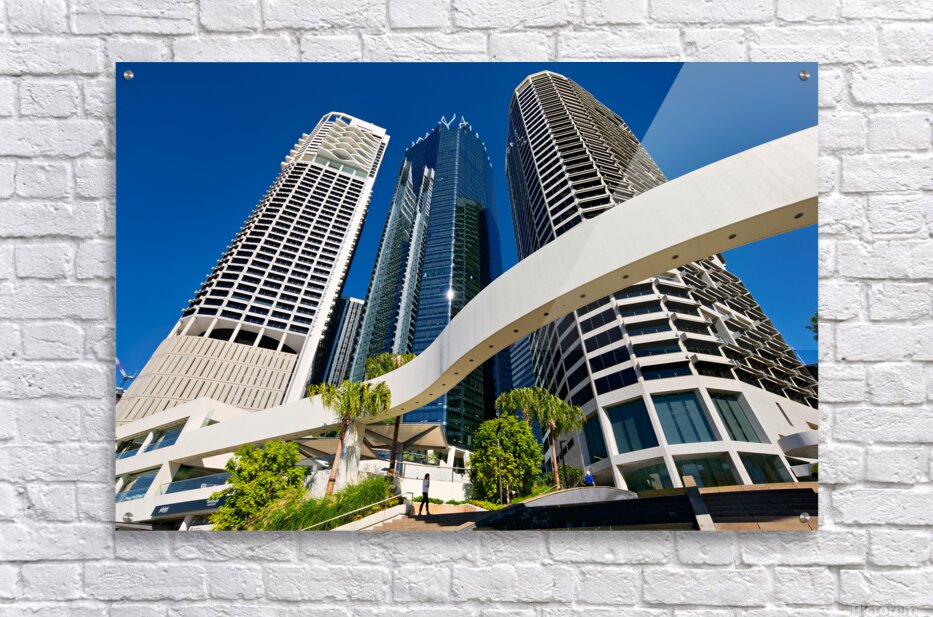 A woman walks up stairs in Brisbane Australia. Skyscrapers rise above her under a blue sky. Palm trees add to the urban scene.