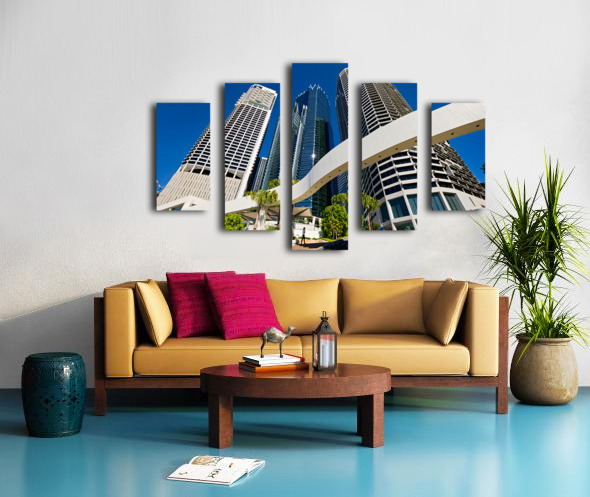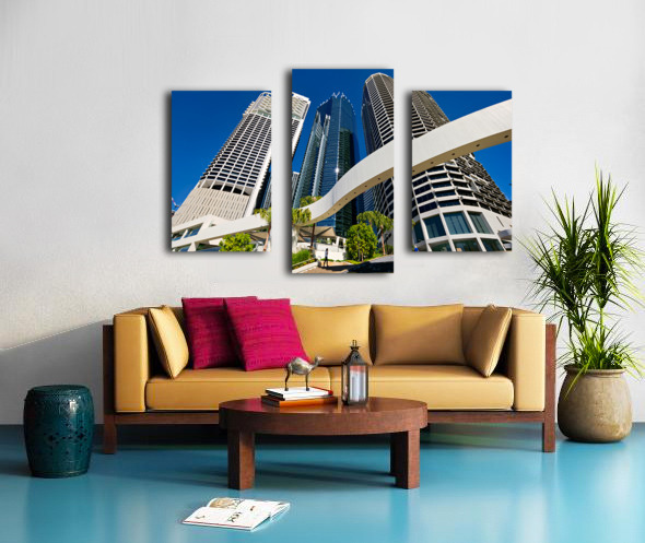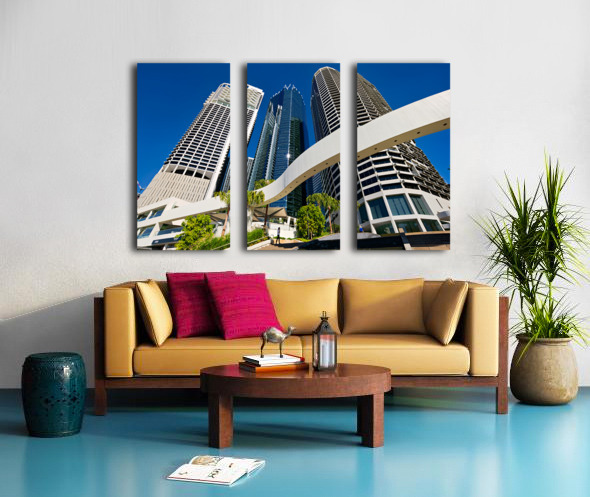 Get this artwork "Woman walks on stairs in modern urban area with tall buildings" in a framed print.