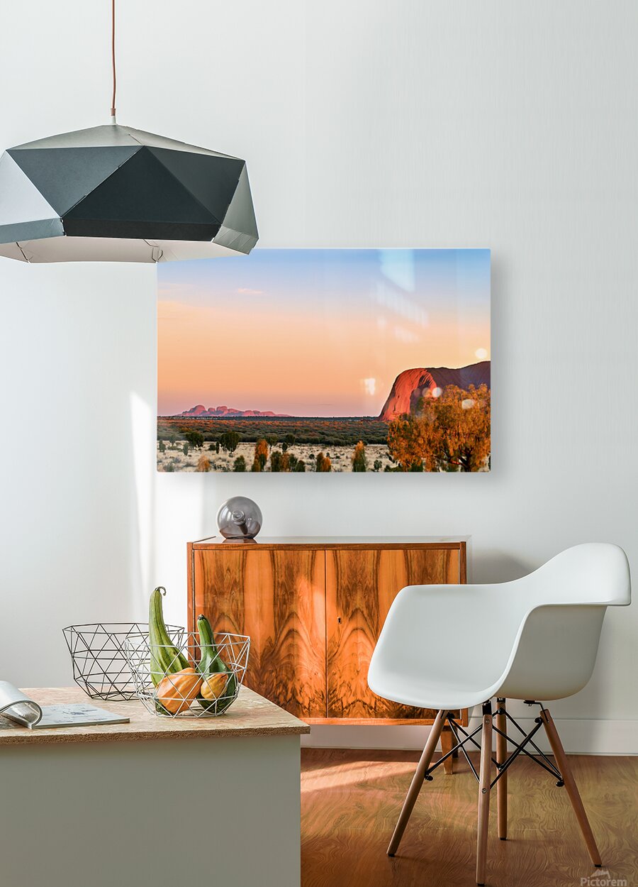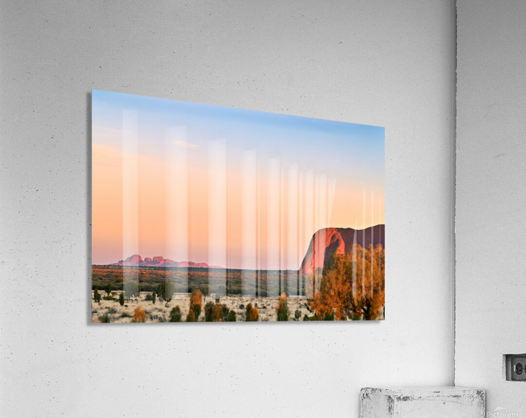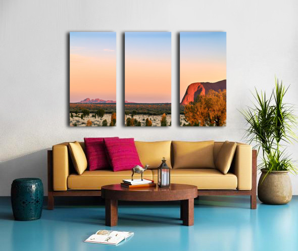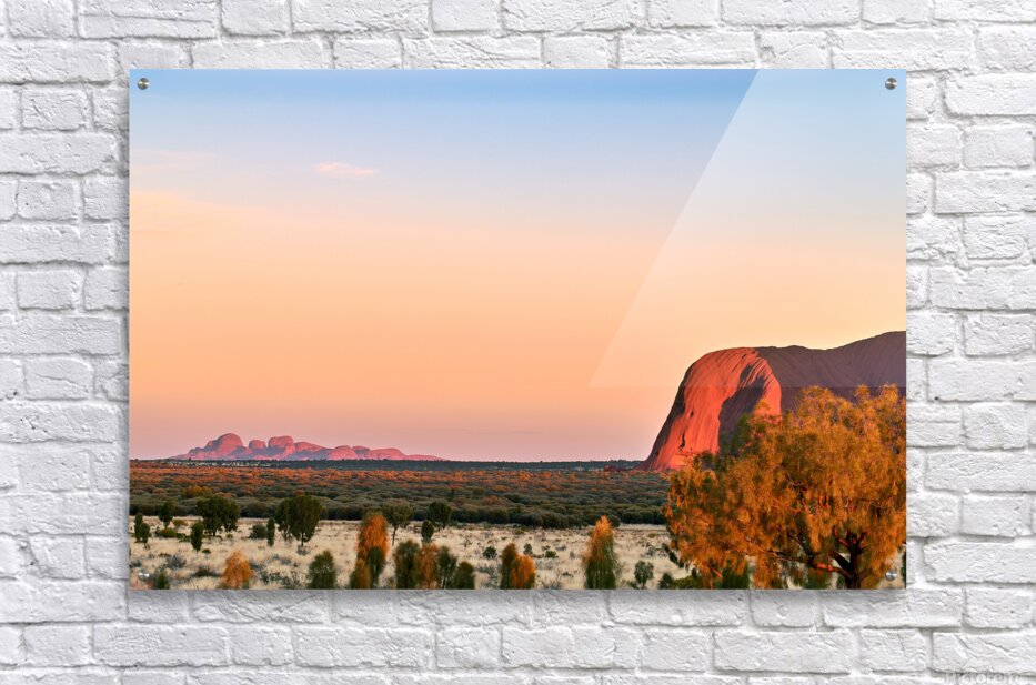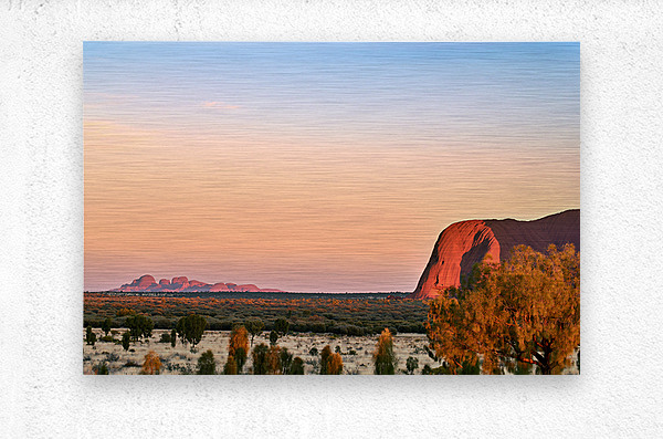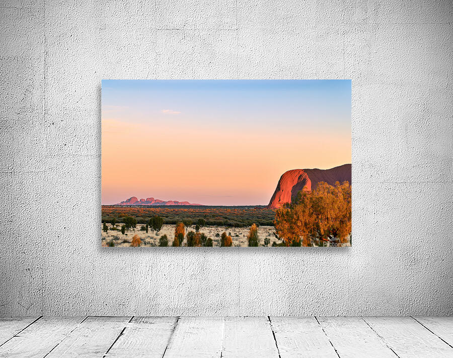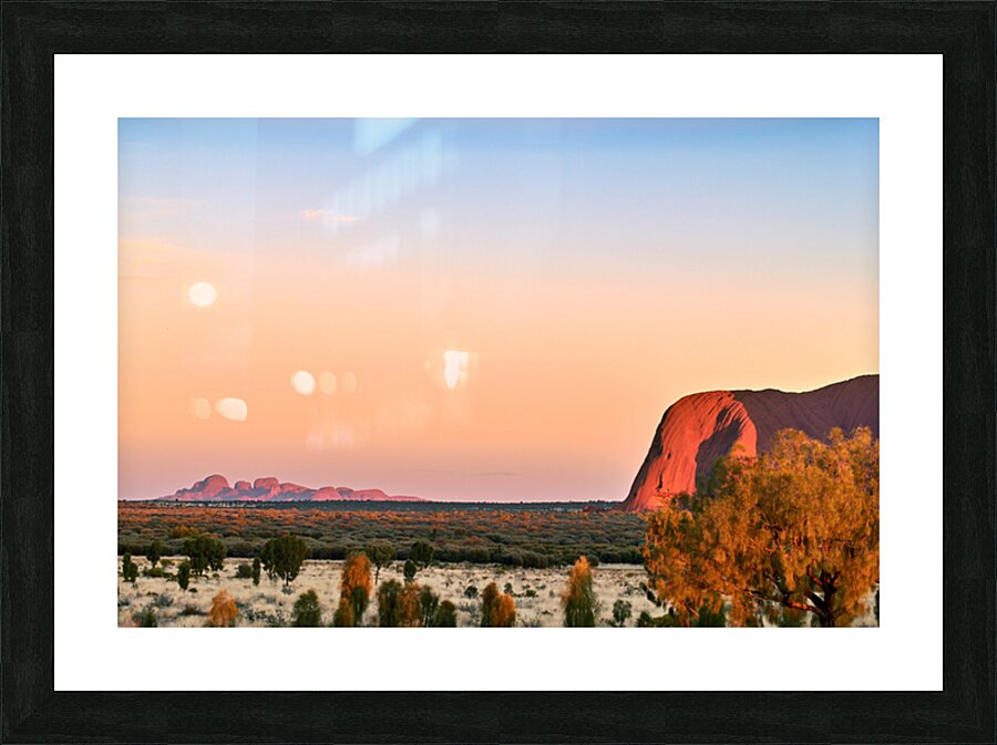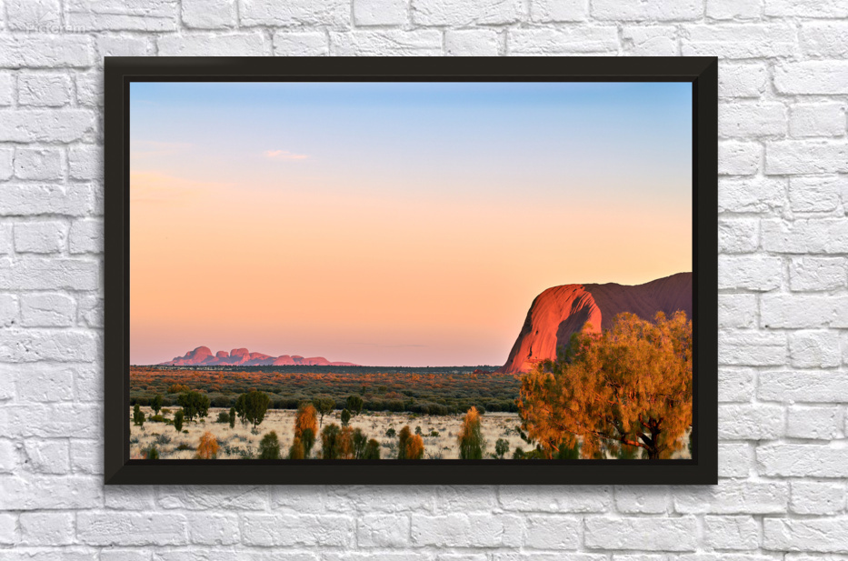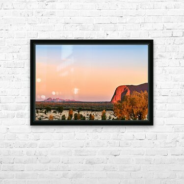 "Uluru and Kata Tjuta at sunset Australia." in a framed print.