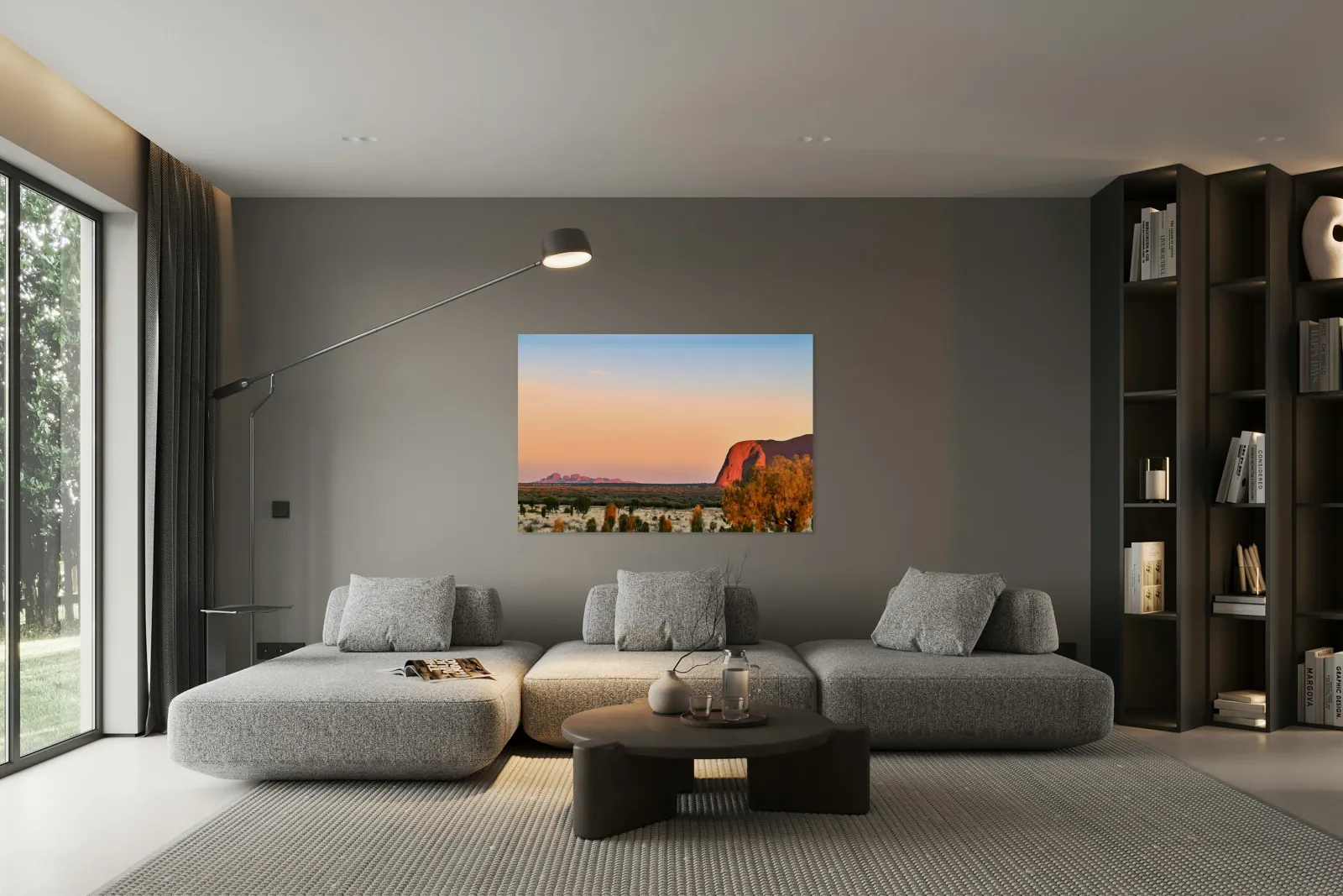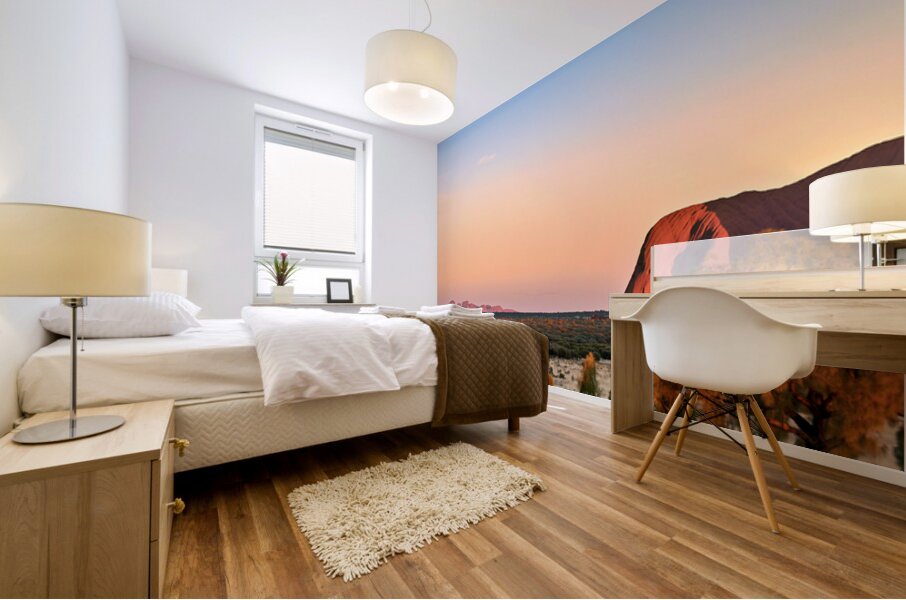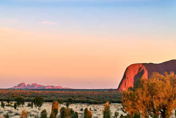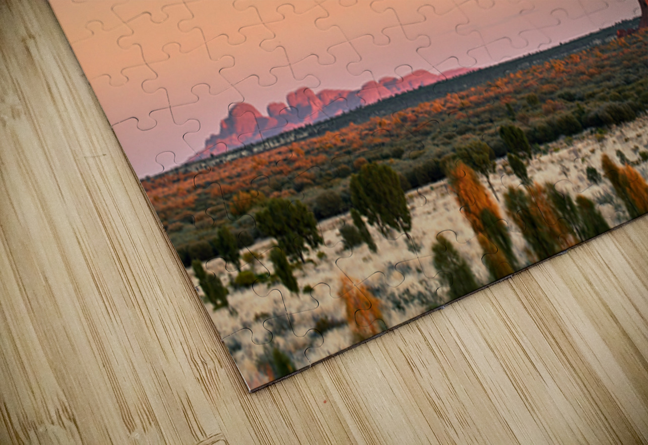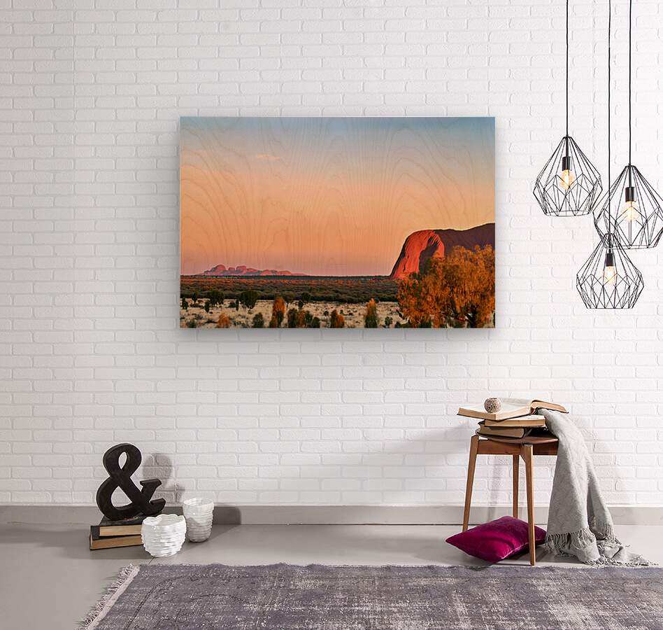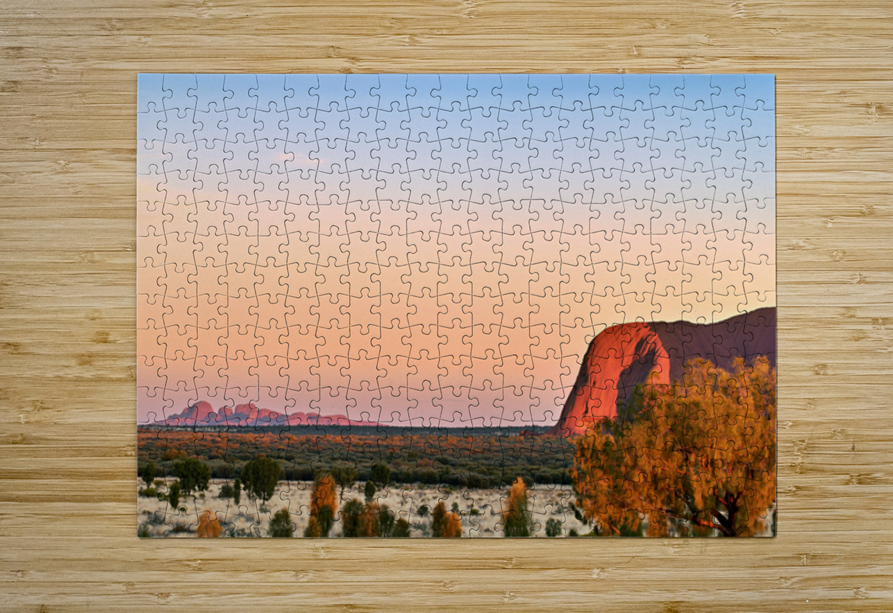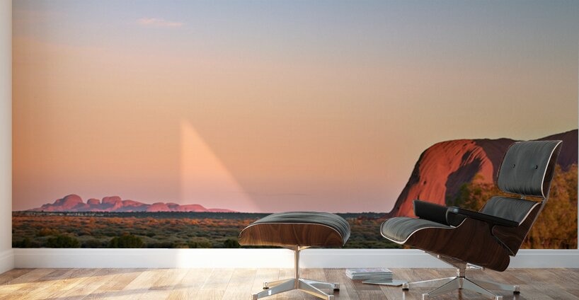 "Uluru and Kata Tjuta at sunset Australia." in a framed print.