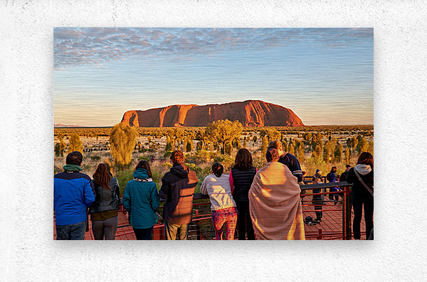 Get this artwork "Tourists watch Uluru glow at sunrise." in a framed print.