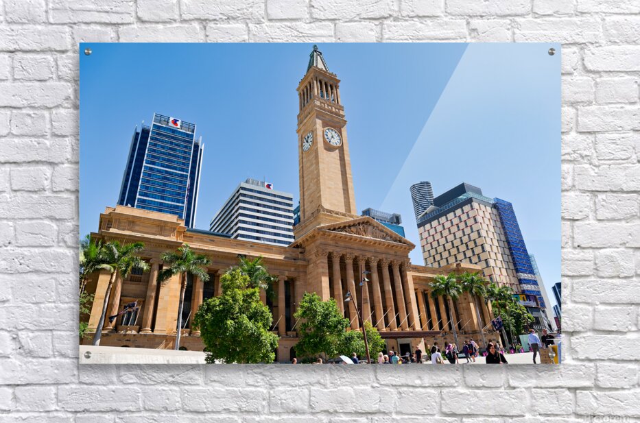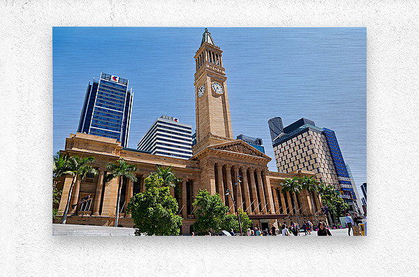 ABOUT THIS ARTWORK: BRISBANE CITY HALL WITH MODERN BUILDINGS AND PALM TREES.