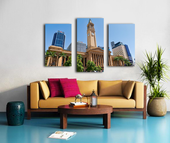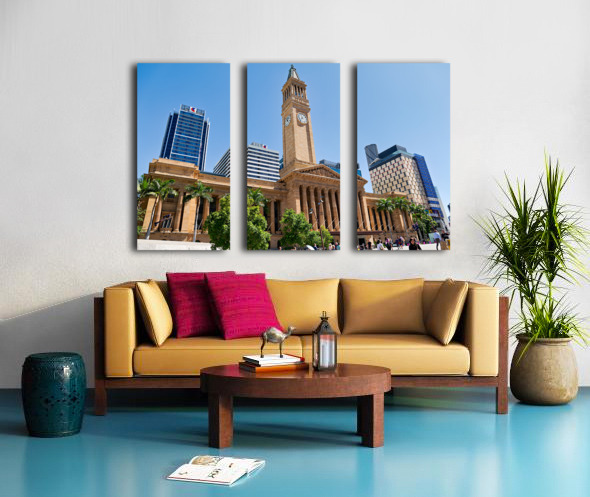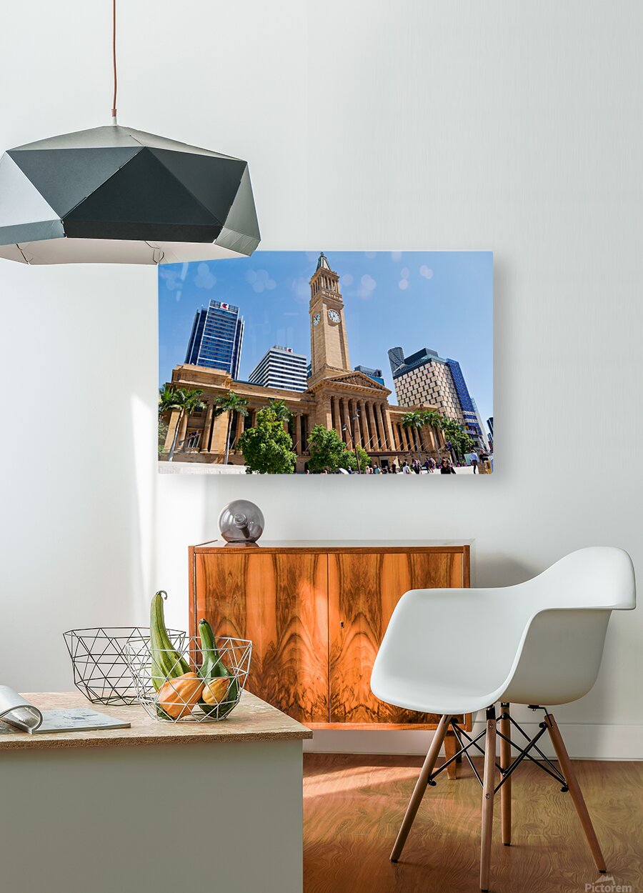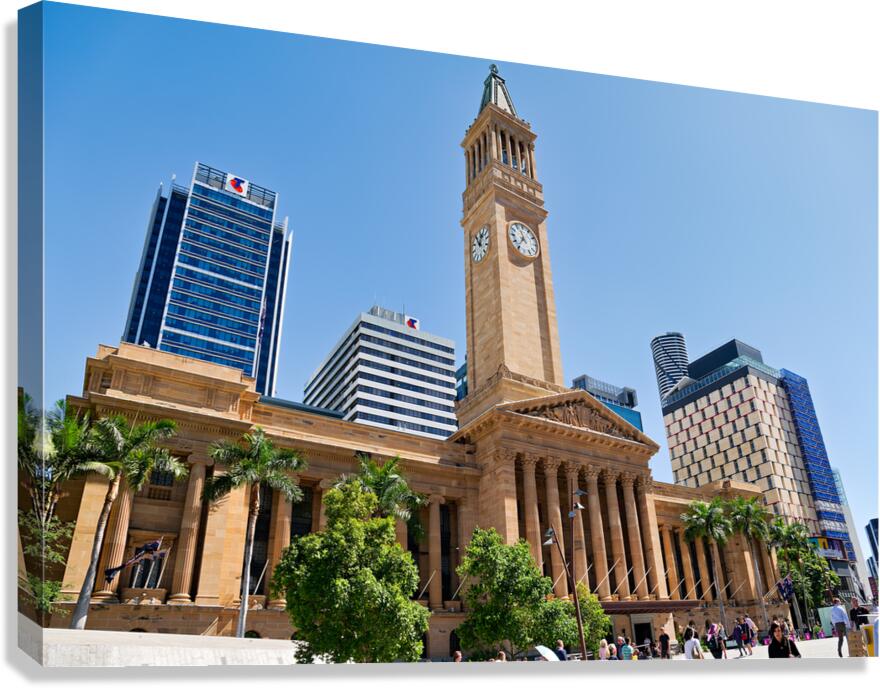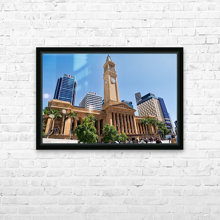Brisbane City Hall with modern buildings and palm trees. Picture Frame Printing