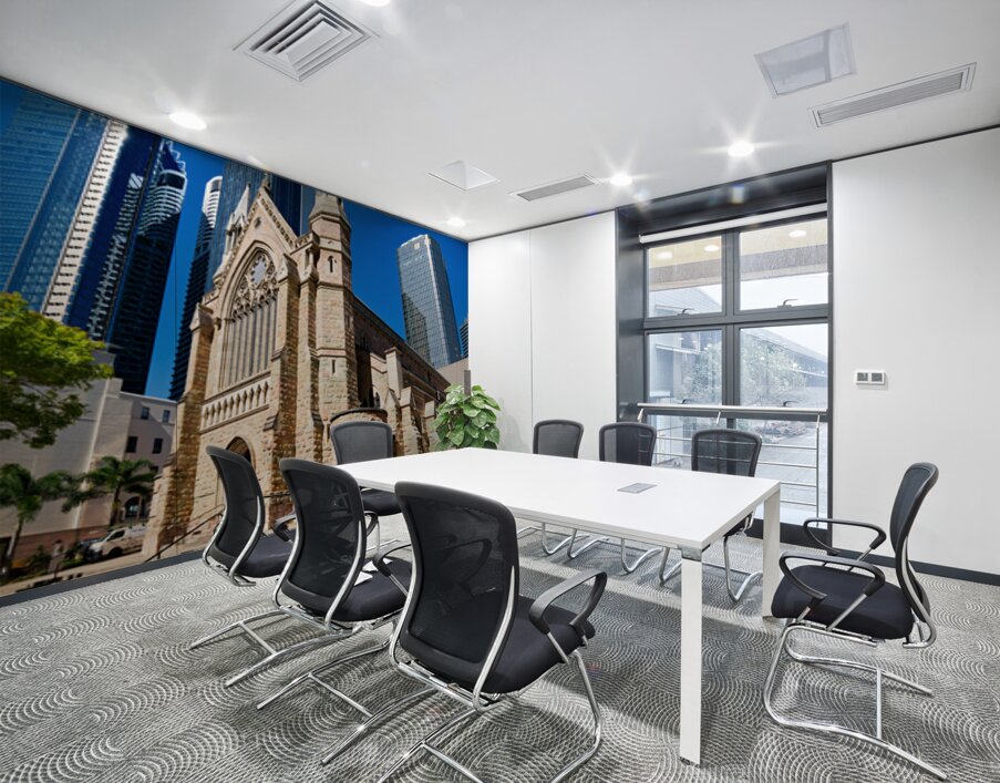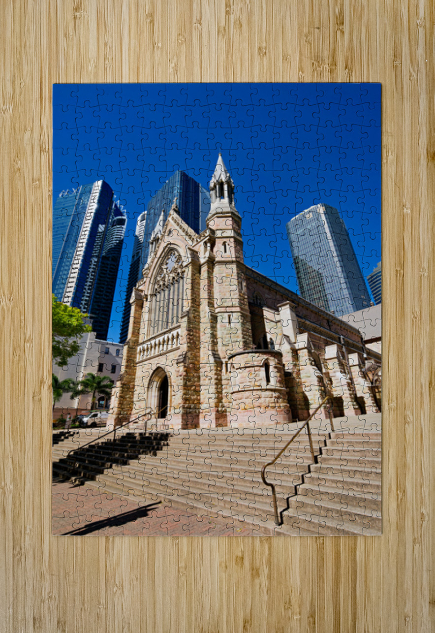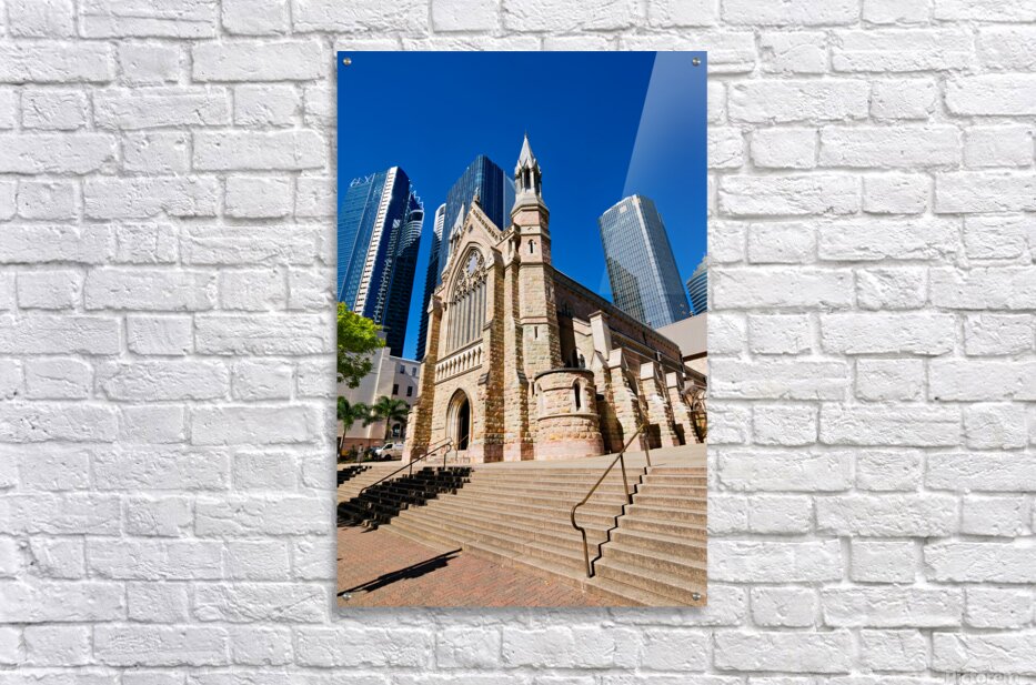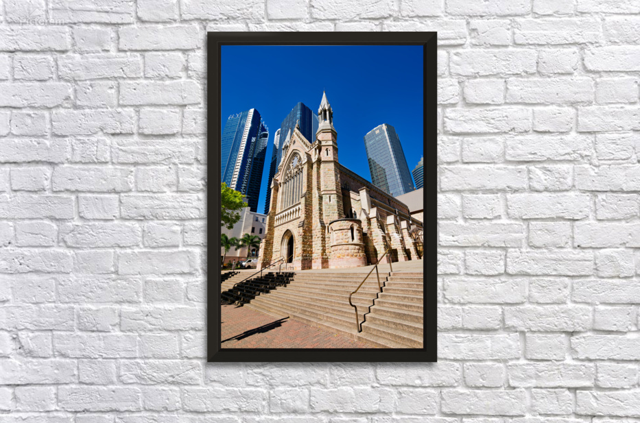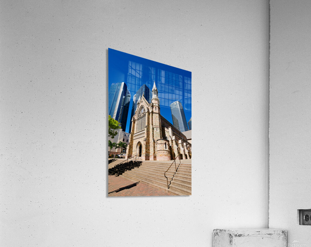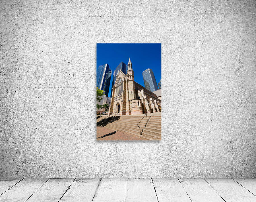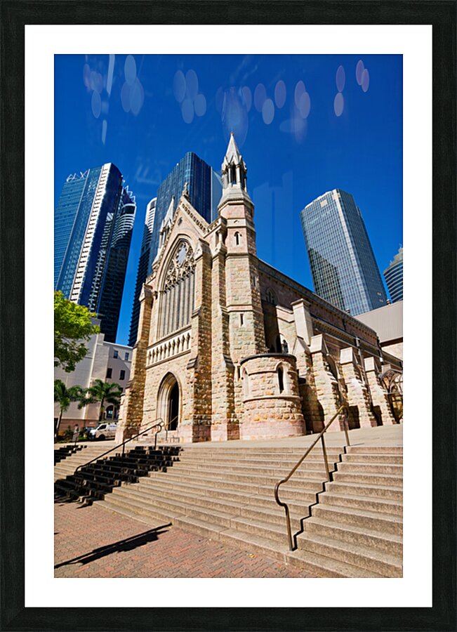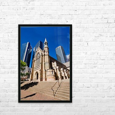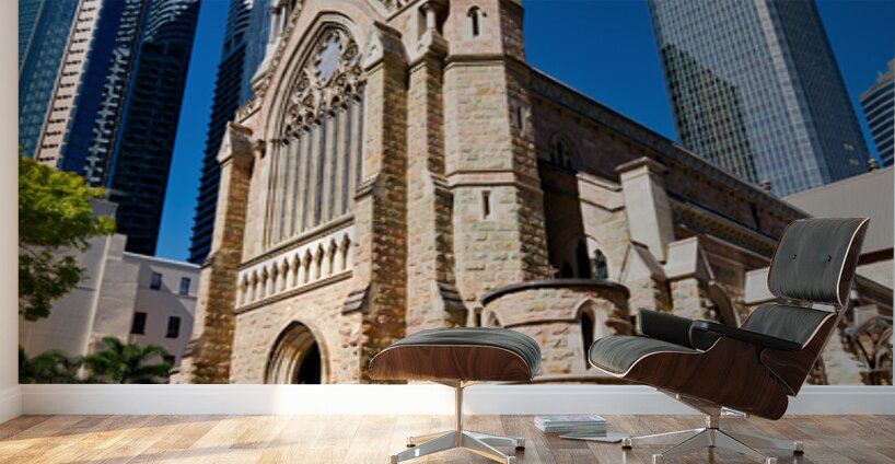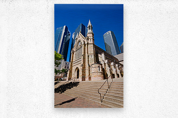Brisbane Australia - A historic church stands tall against a backdrop of modern skyscrapers symbolizing the blend of old and new in the city.