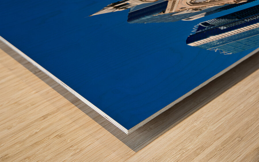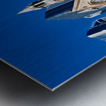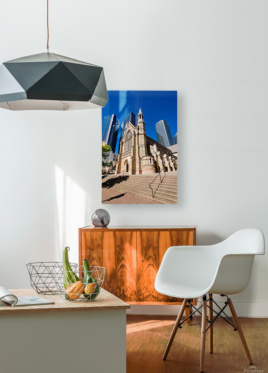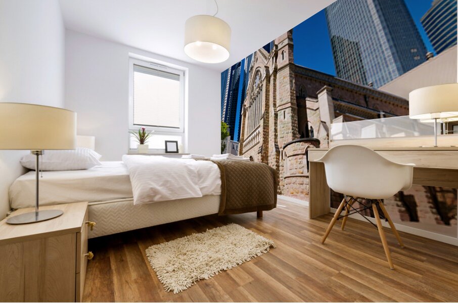 "Historic church stands tall against modern skyscrapers." in a framed print.