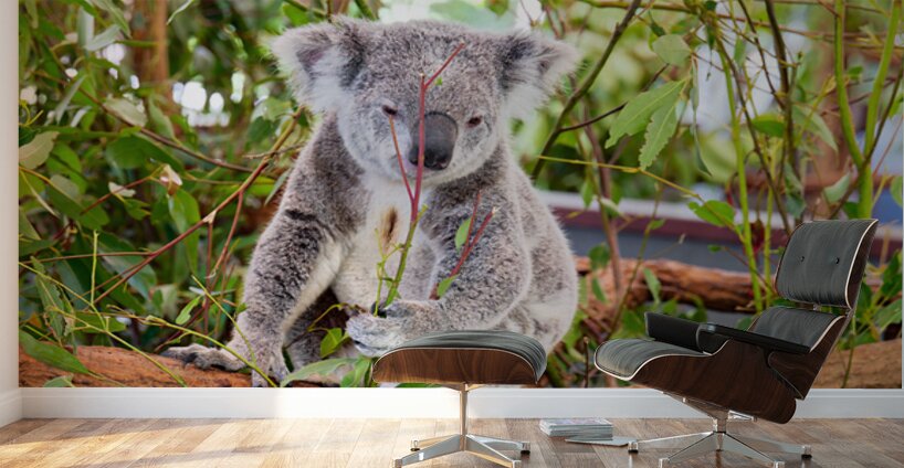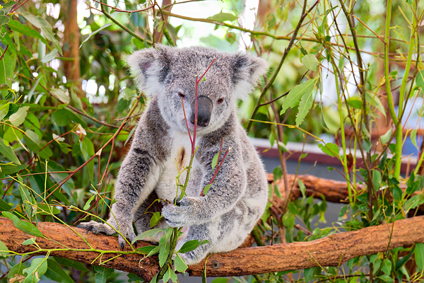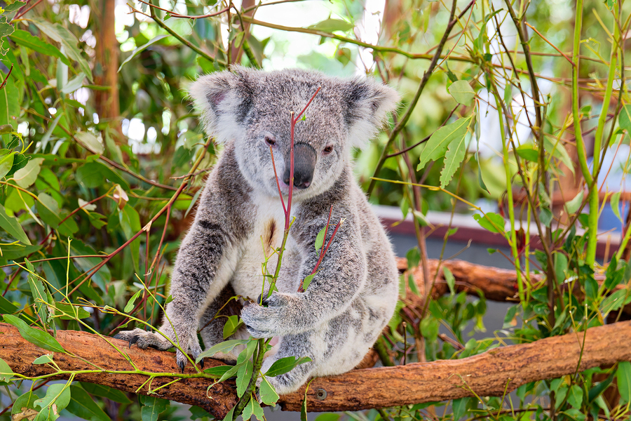 A koala sits on a tree branch eating eucalyptus leaves. Koalas are marsupials native to Australia and are known for their diet of eucalyptus.