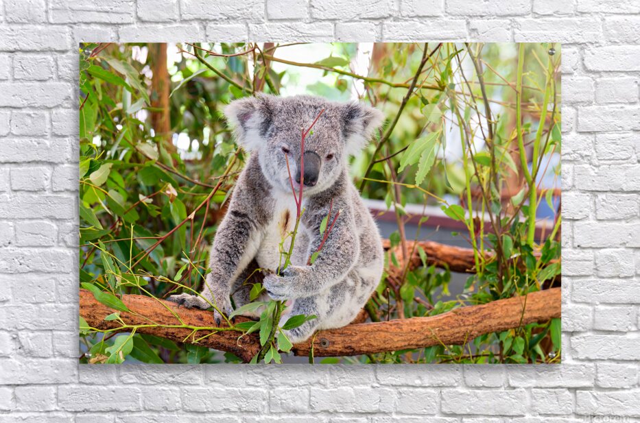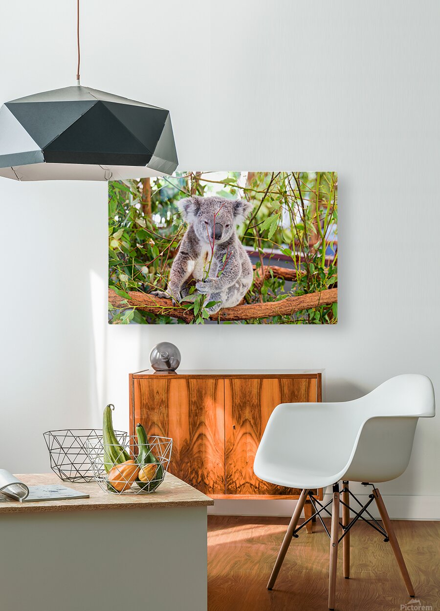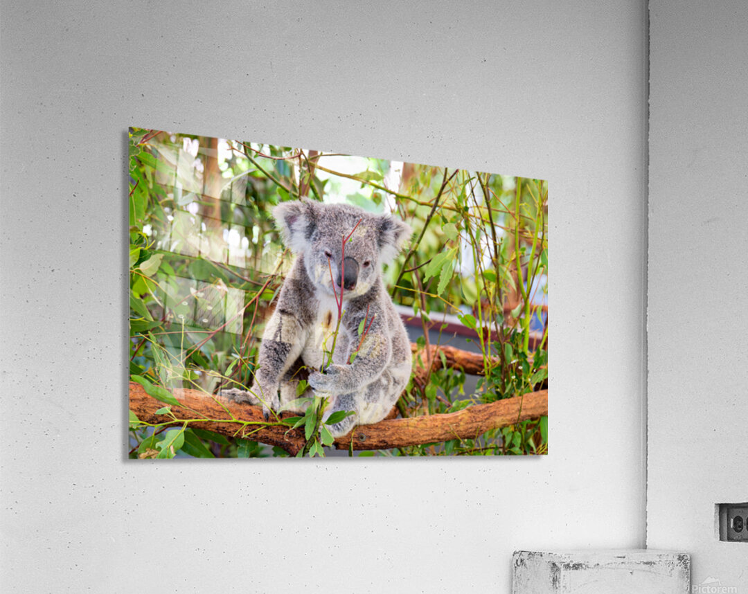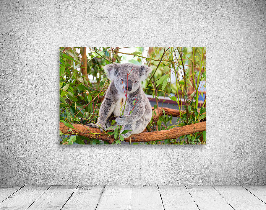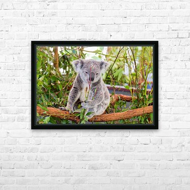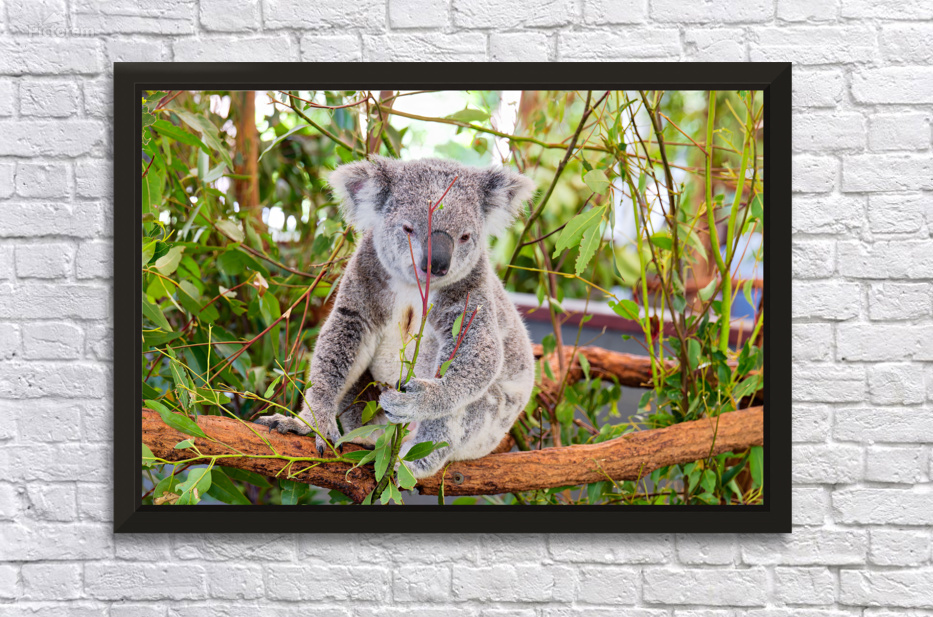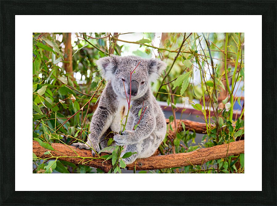 "Koala eating eucalyptus leaves in a tree." in a framed print.