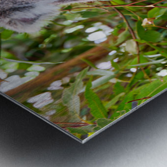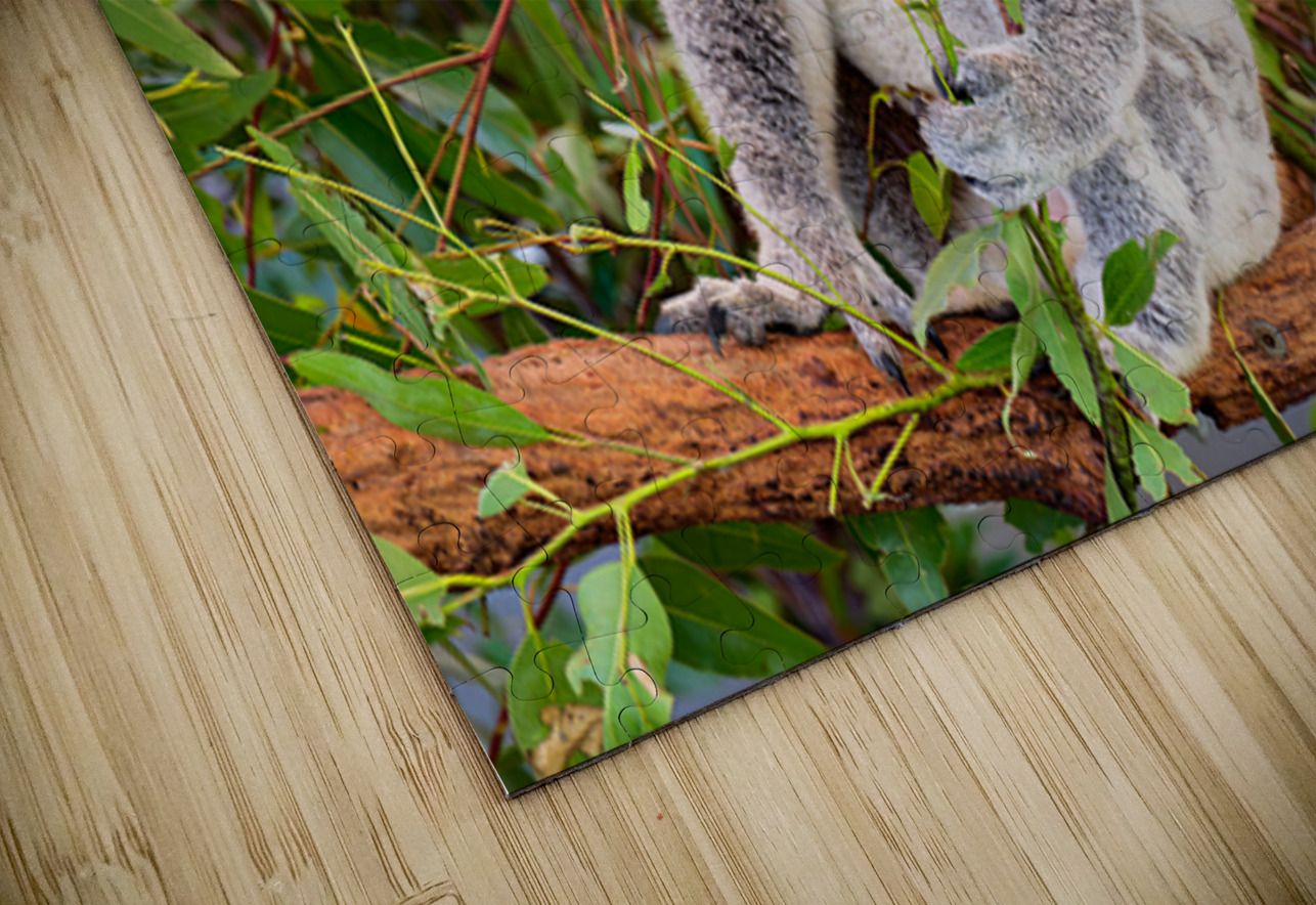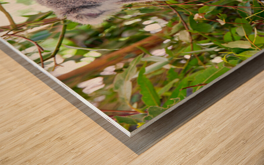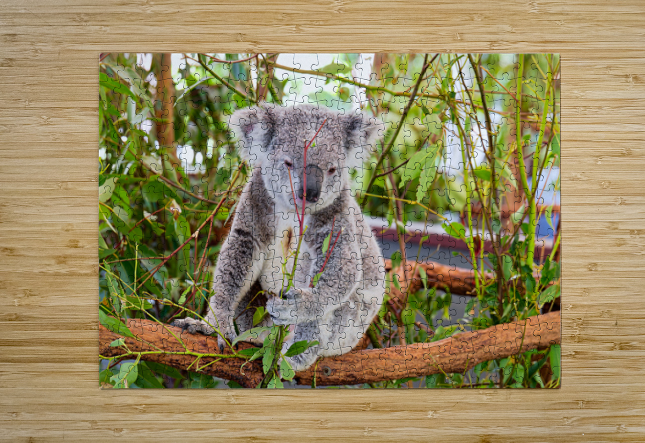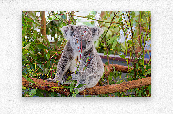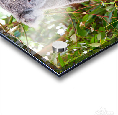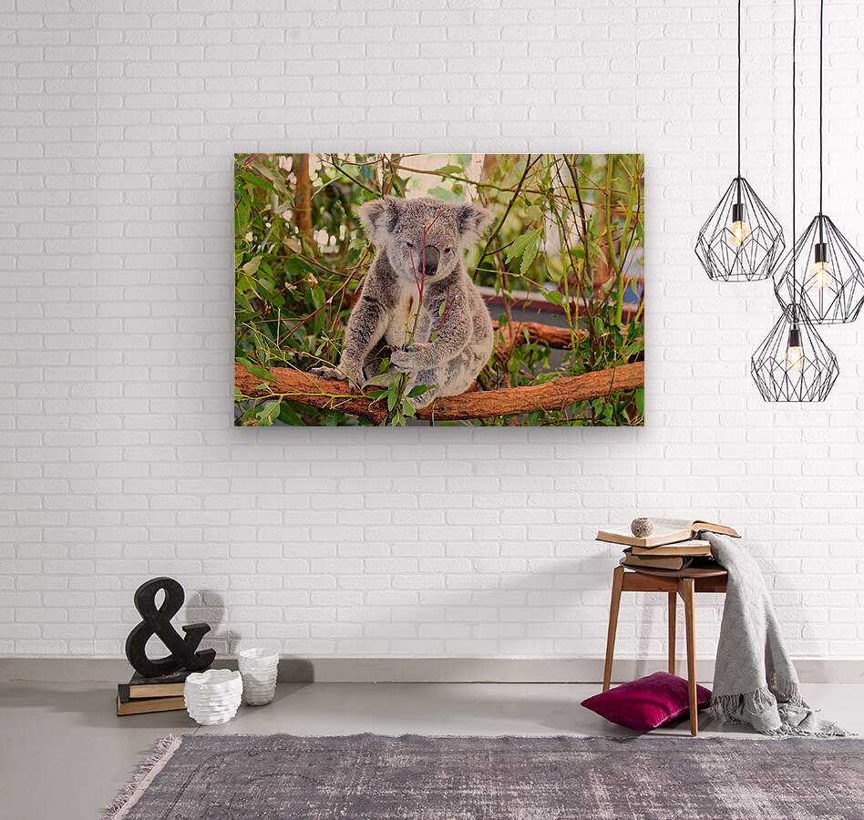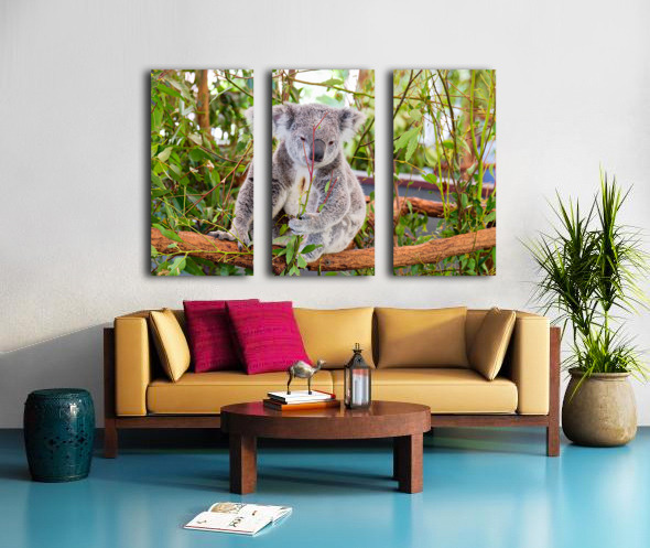 "Koala eating eucalyptus leaves in a tree." in a framed print.