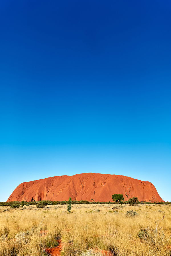 ULURU MONOLITH UNDER A CLEAR BLUE SKY.