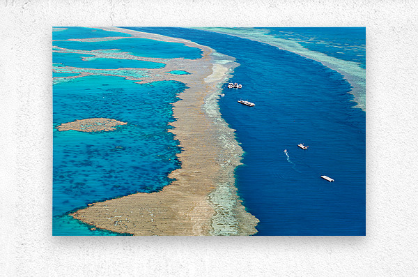 ABOUT THIS ARTWORK: AERIAL VIEW OF CORAL REEFS AND BOATS IN TURQUOISE OCEAN.