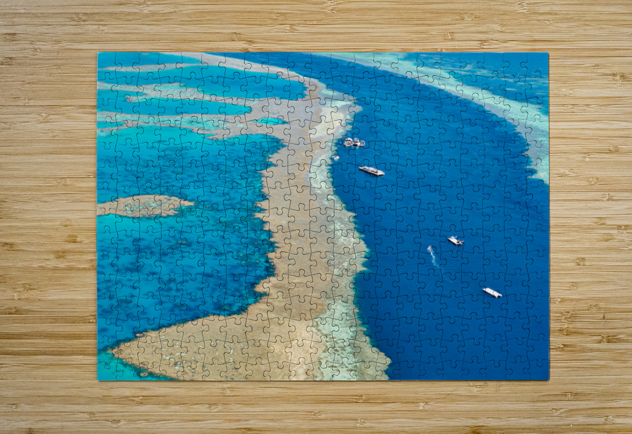 Aerial view of coral reefs and boats in turquoise ocean. Marco Brivio Puzzle printing
