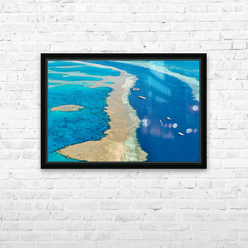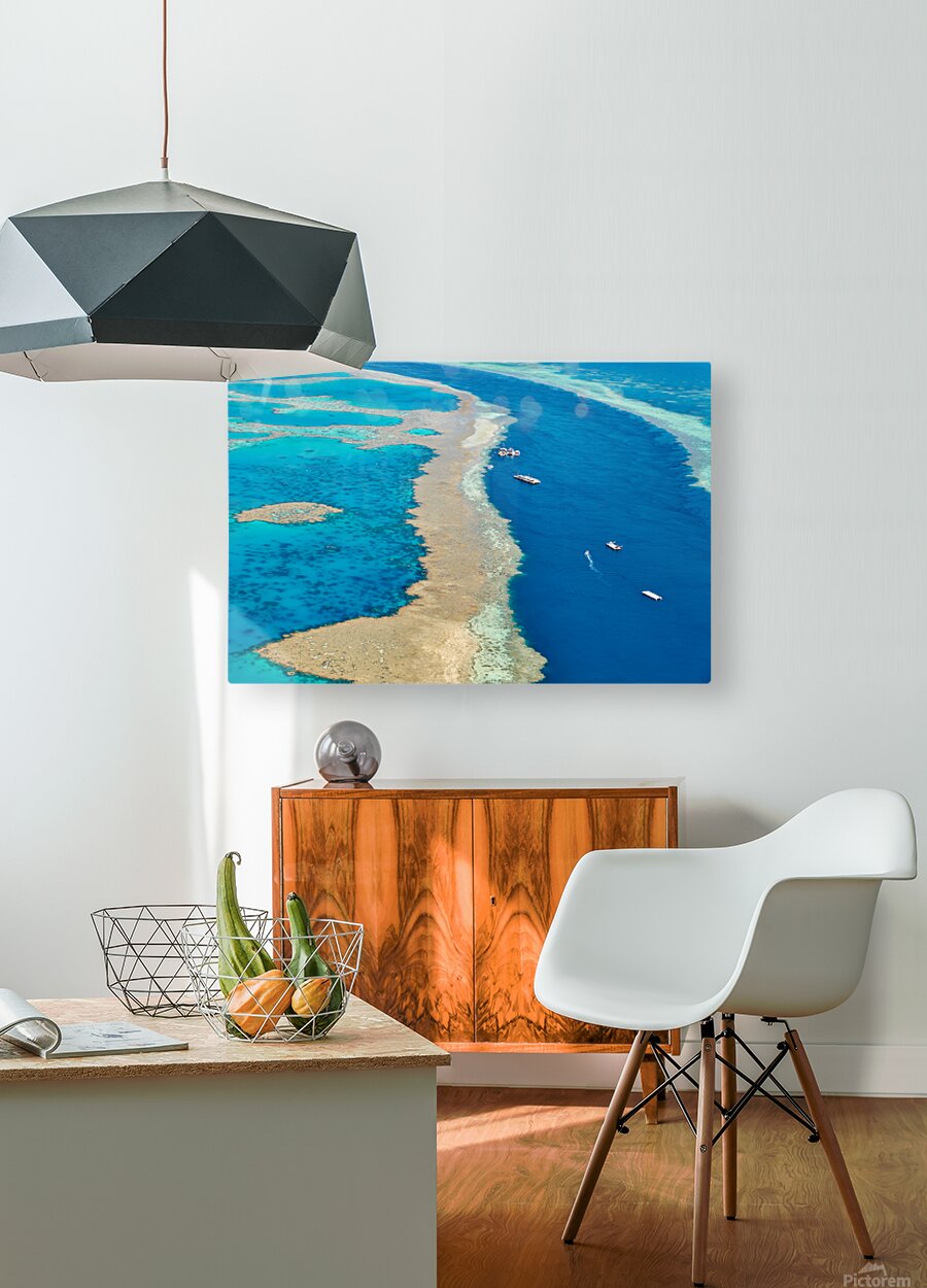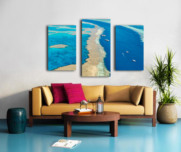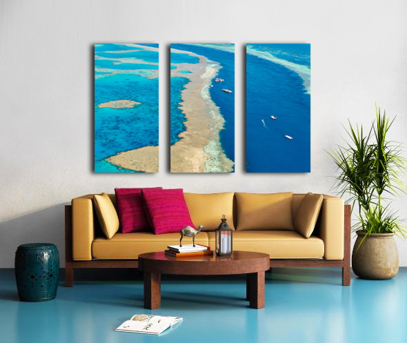 Get this artwork "Aerial view of coral reefs and boats in turquoise ocean." in a framed print.