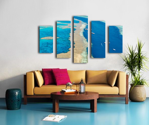 Aerial view of coral reefs and boats in turquoise ocean. Frame print