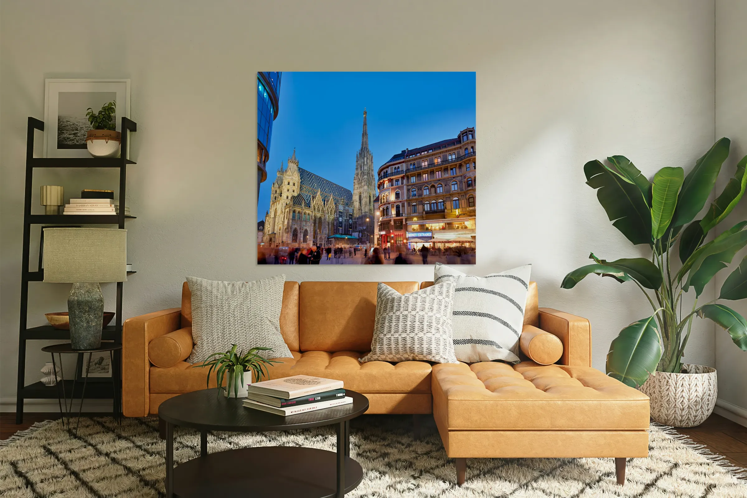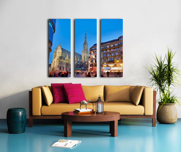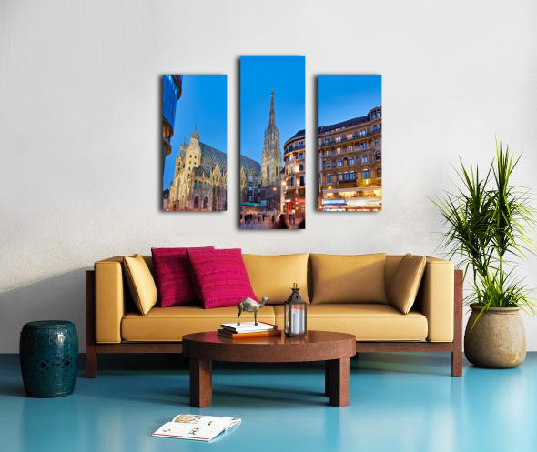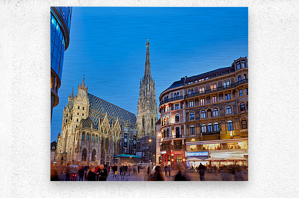 ABOUT THIS ARTWORK: ST. STEPHENS CATHEDRAL AT DUSK IN BUSTLING VIENNA.