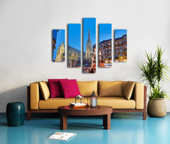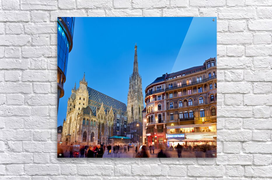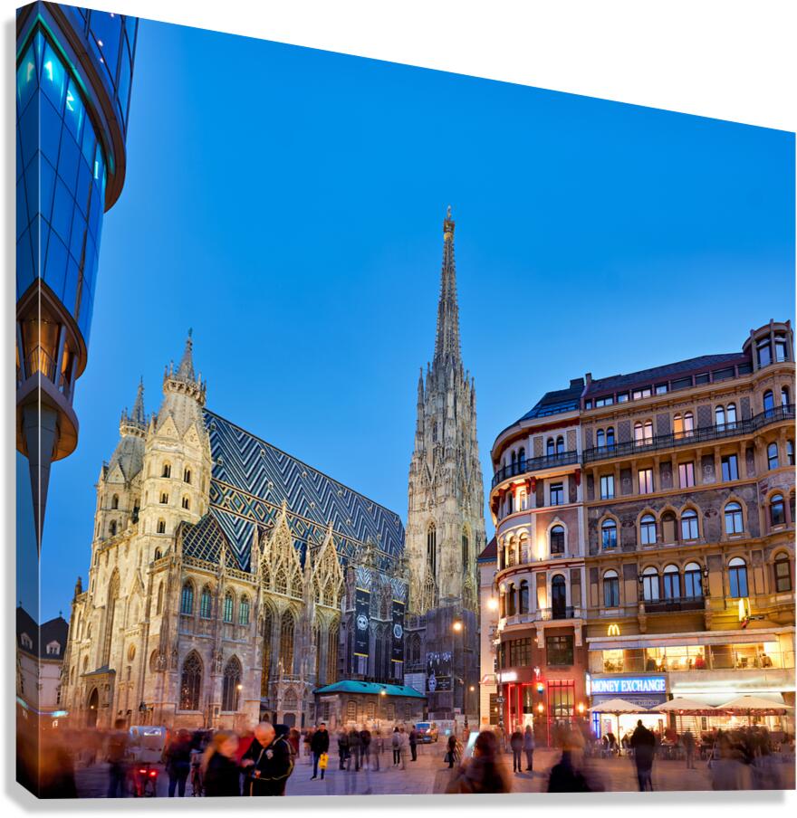 Get this artwork "St. Stephens Cathedral at dusk in bustling Vienna." in a framed print.