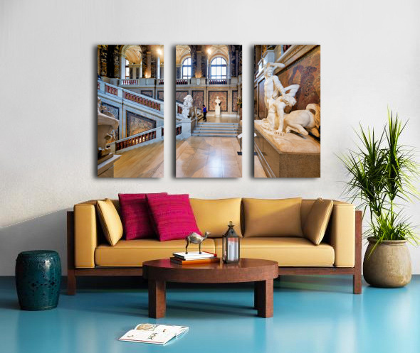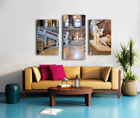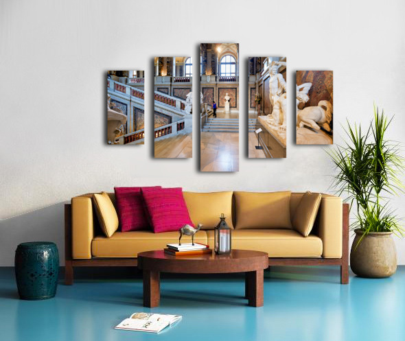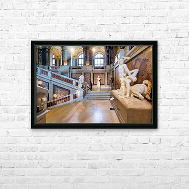 Ornate museum hall with statues grand staircase and visitor. Frame print