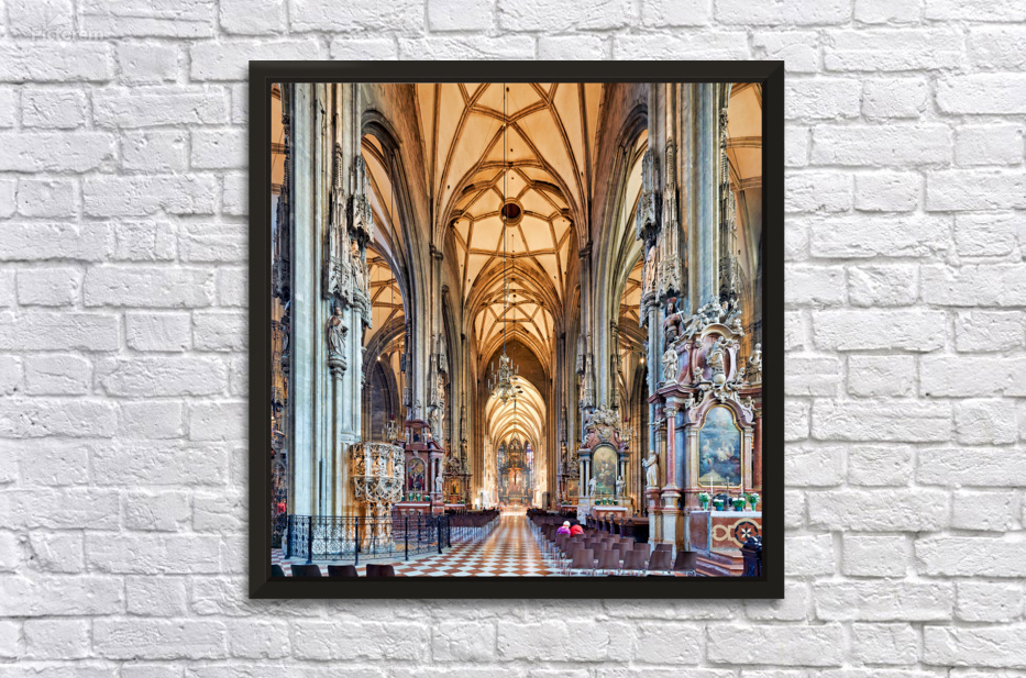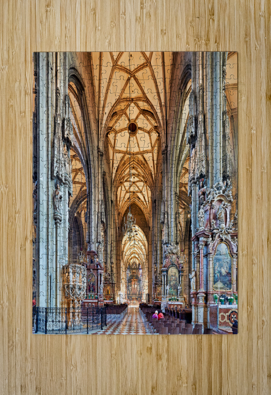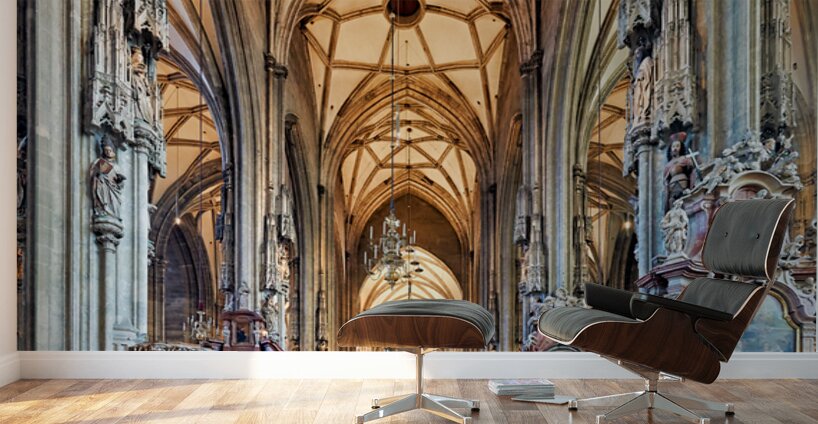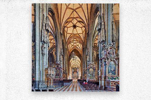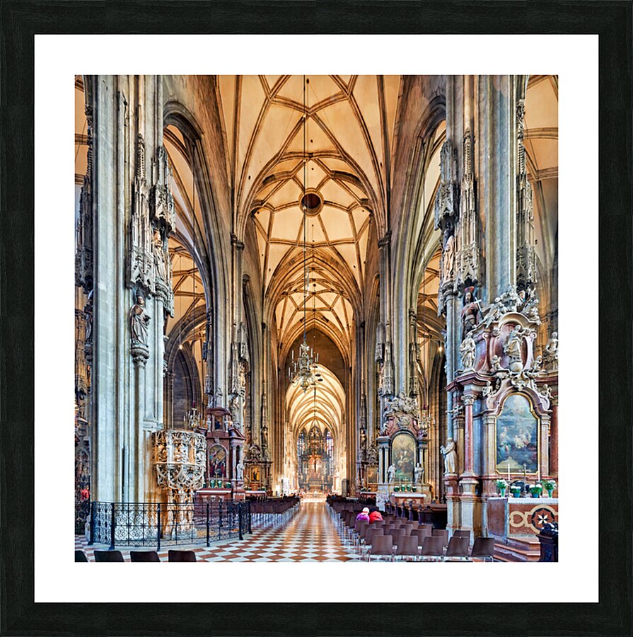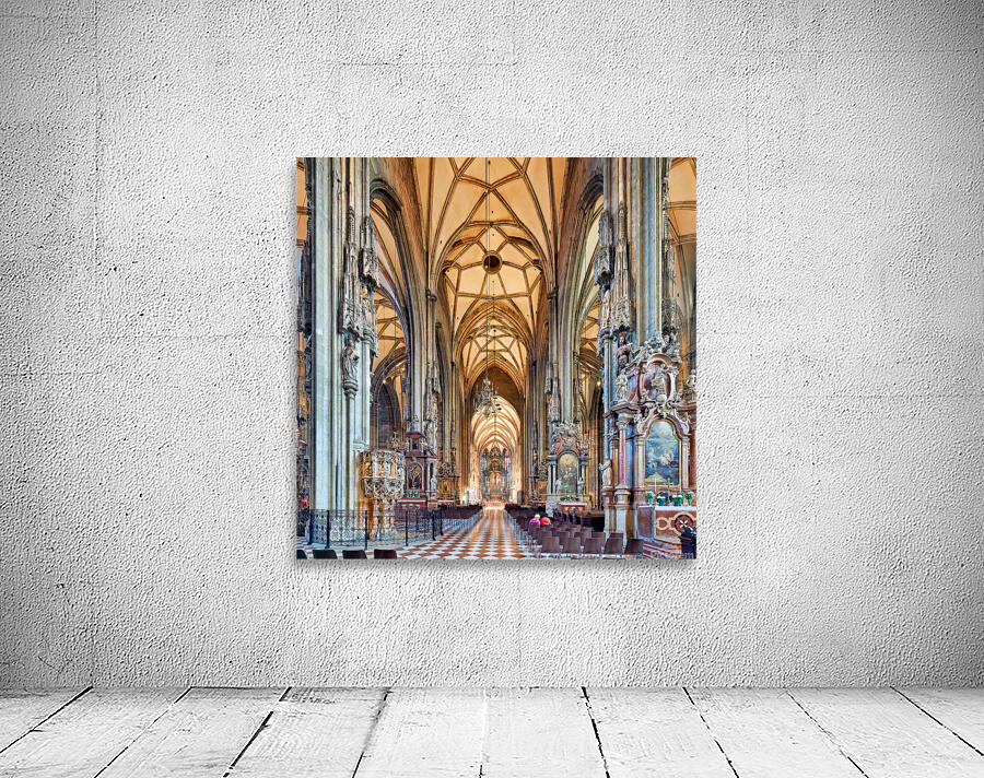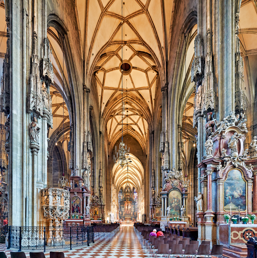 Visitors inside St. Stephens Cathedral Stephansdom in Vienna Austria admiring the stunning Gothic architecture and religious art.