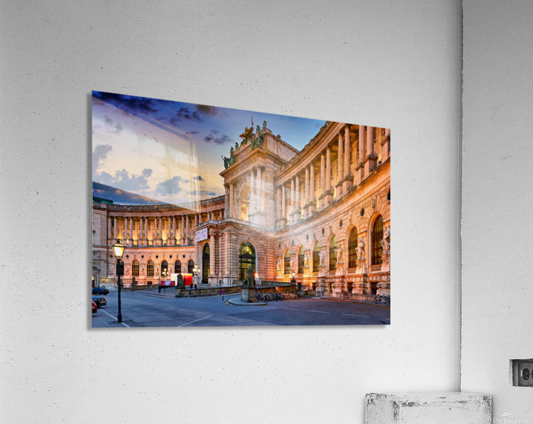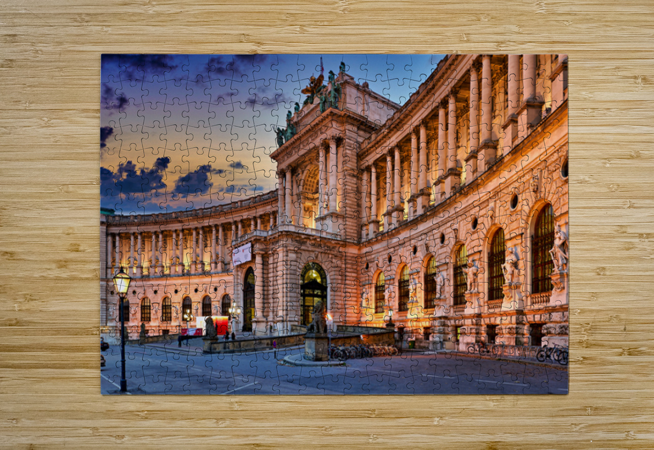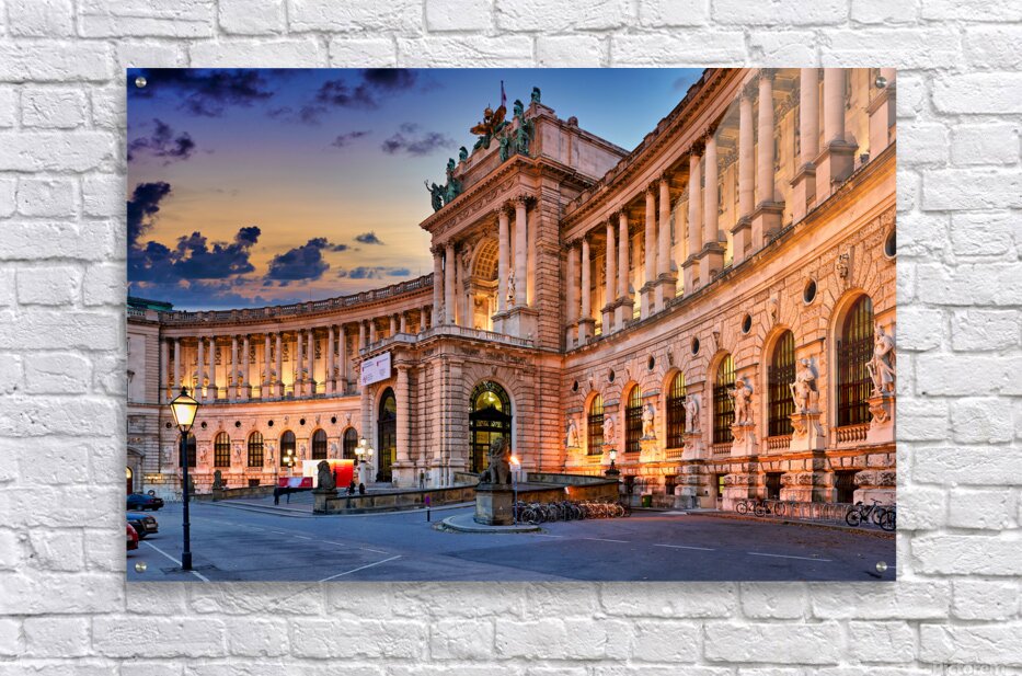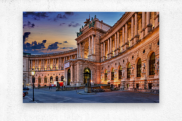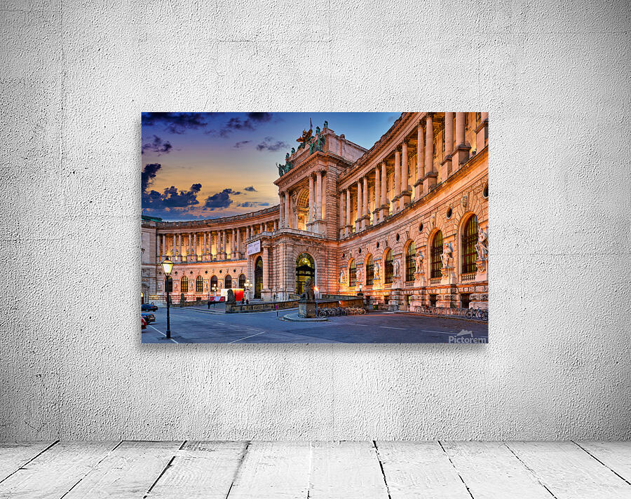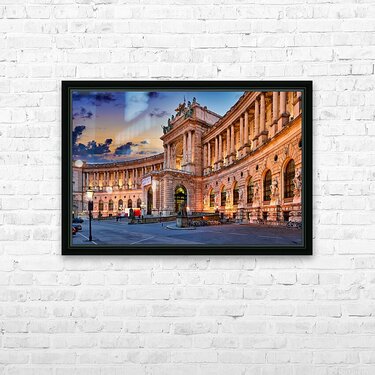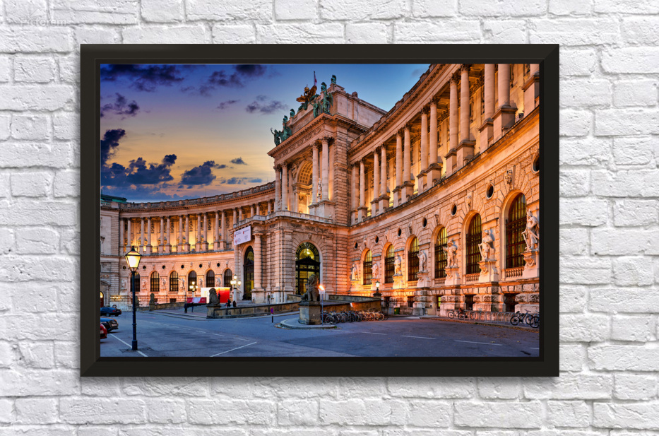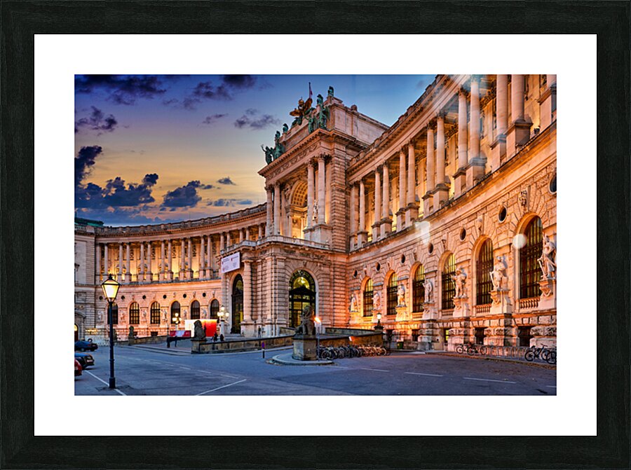"Hofburg Palace Vienna illuminated at dusk." in a framed print.