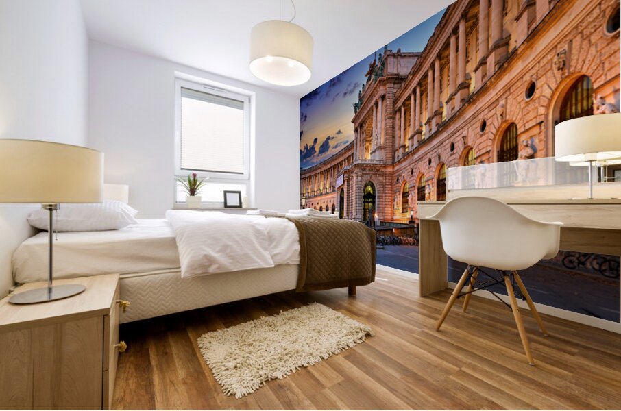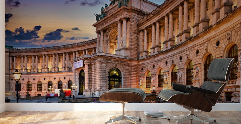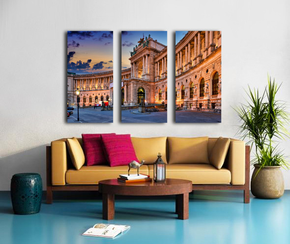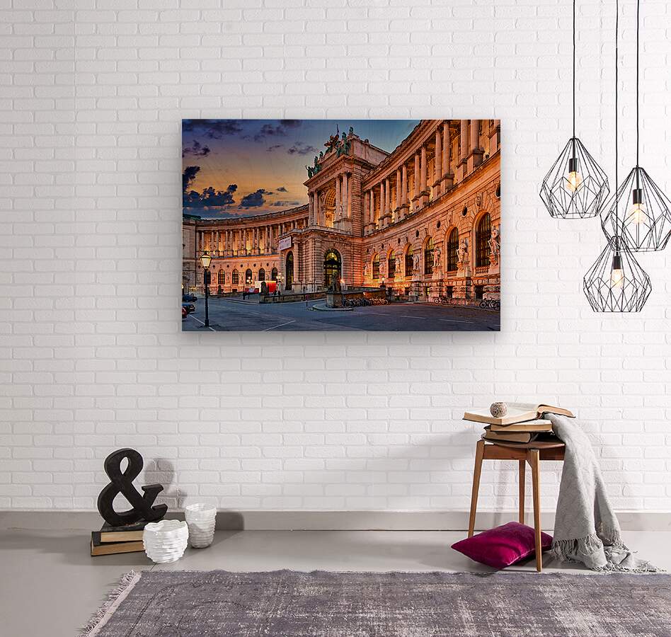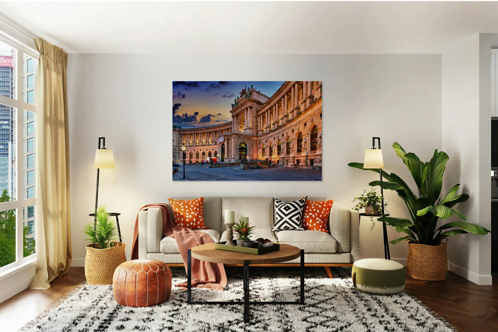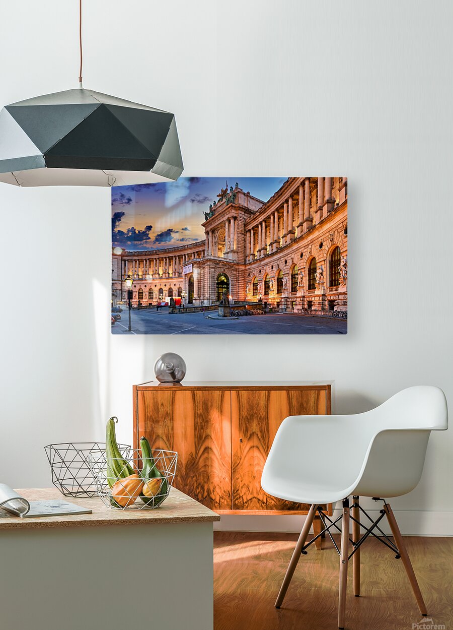 "Hofburg Palace Vienna illuminated at dusk." in a framed print.
