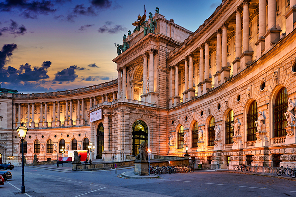 Hofburg Palace in Vienna Austria illuminated at twilight a historic imperial residence and cultural landmark.