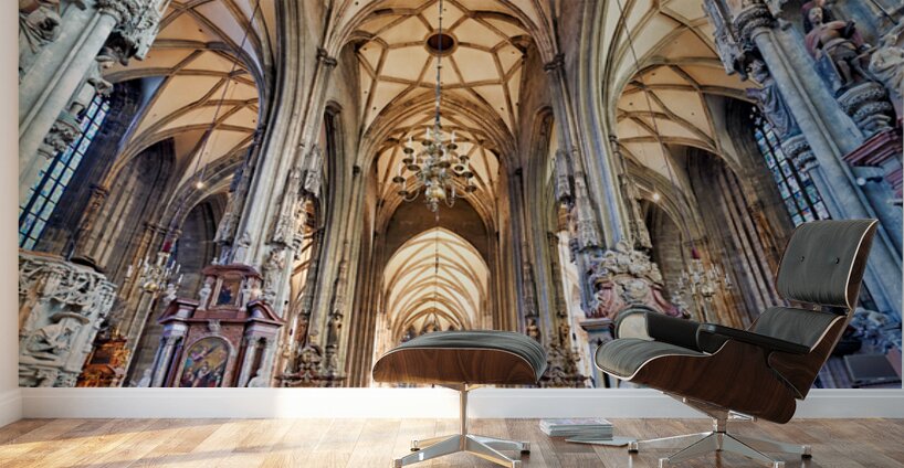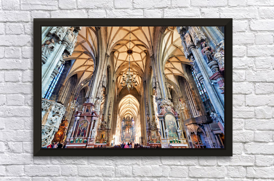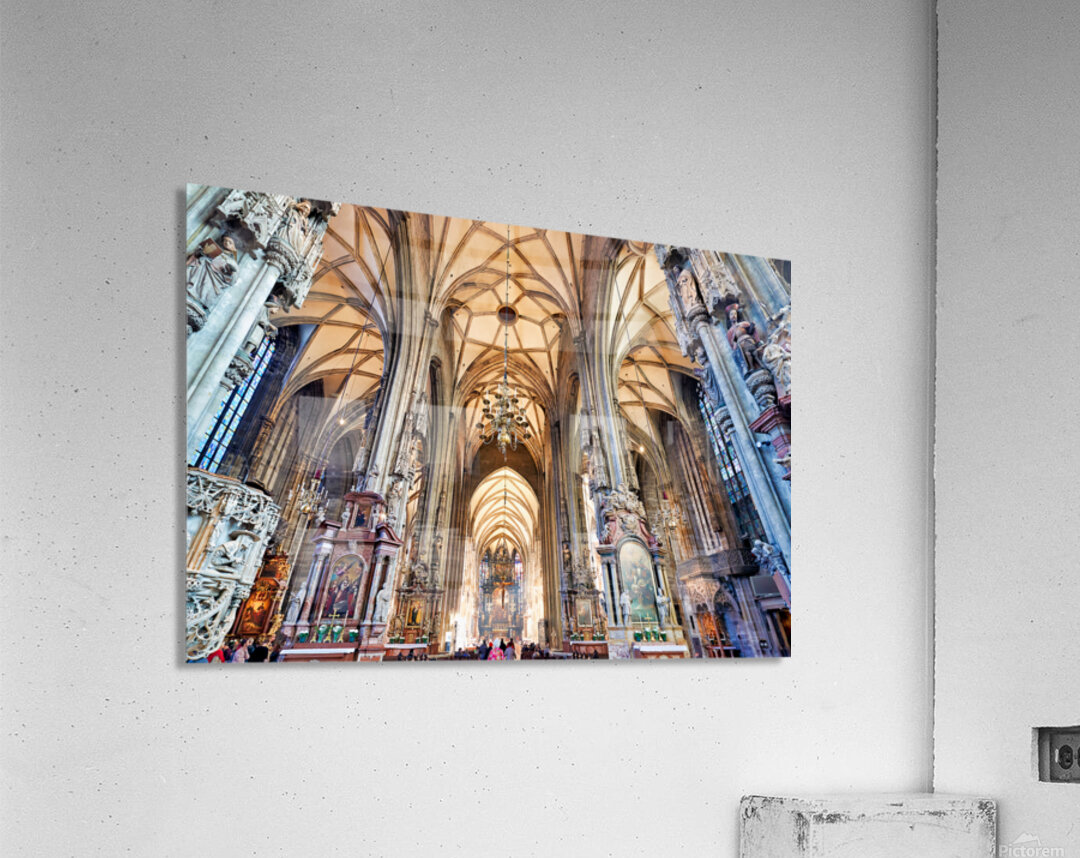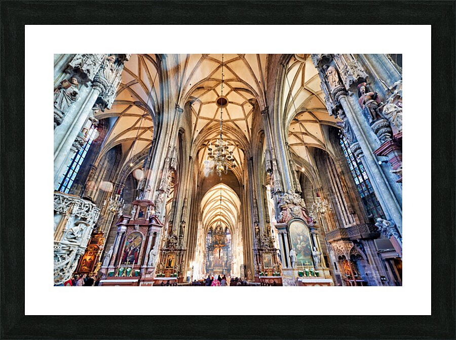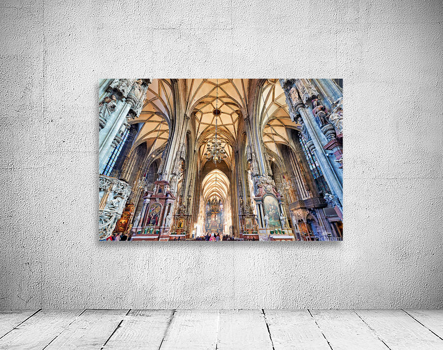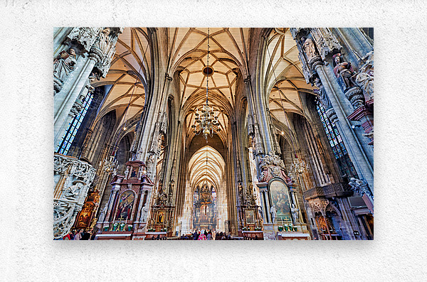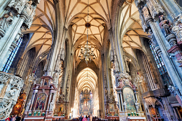 Tourists admire the stunning Gothic architecture and religious art inside St. Stephens Cathedral Stephansdom in Vienna Austria.