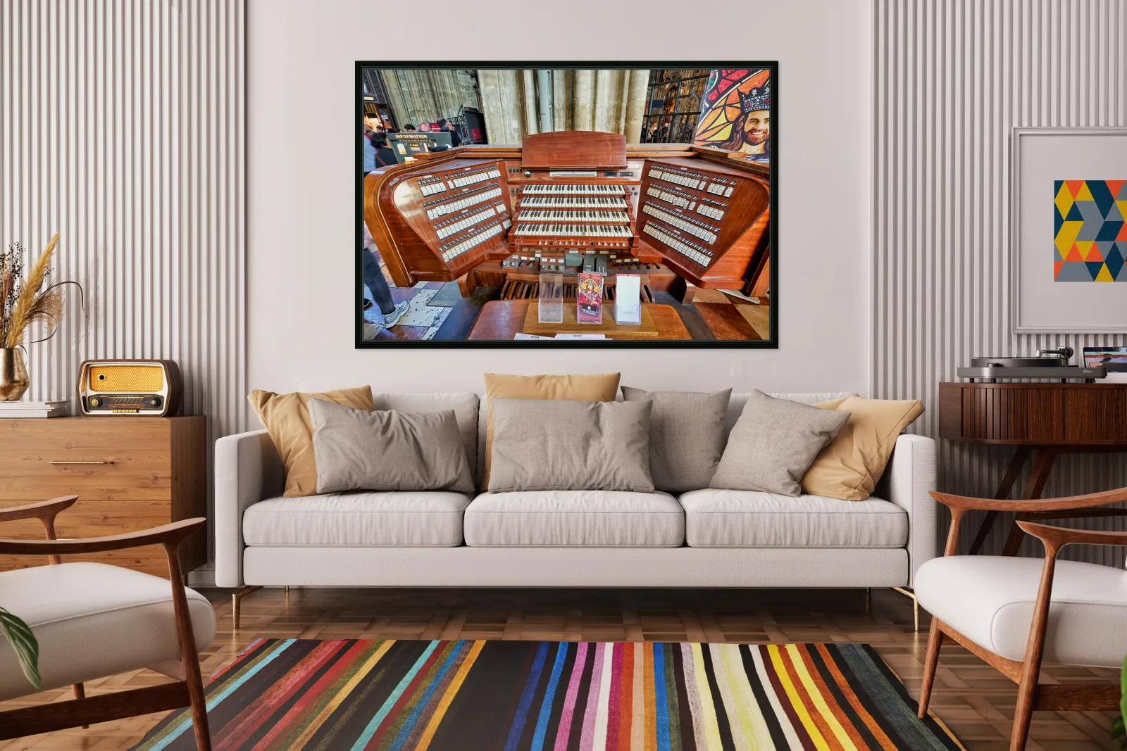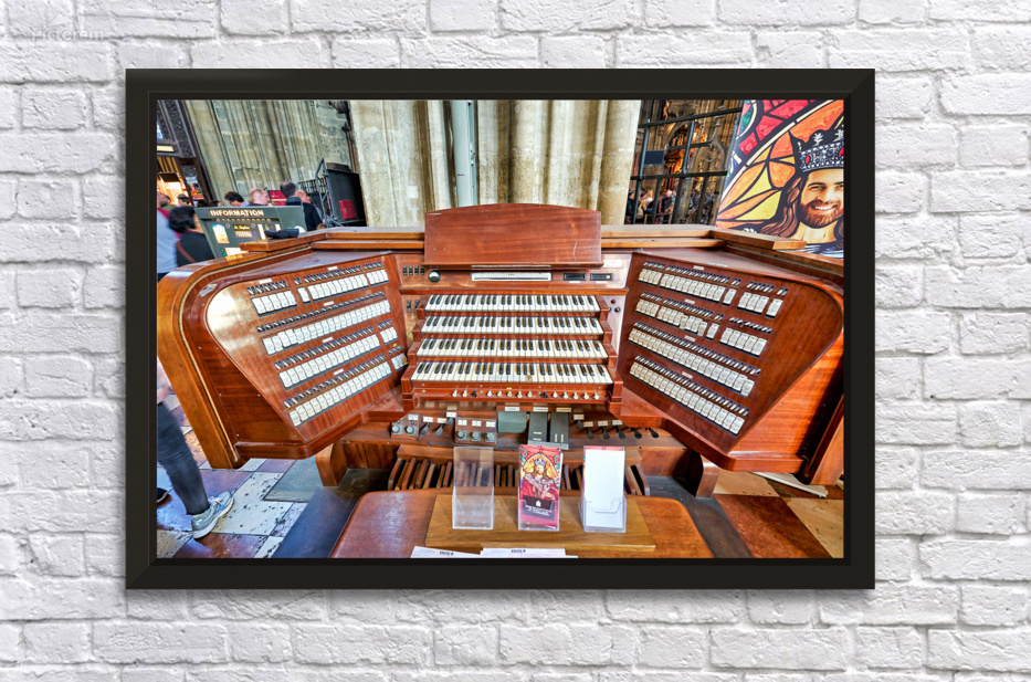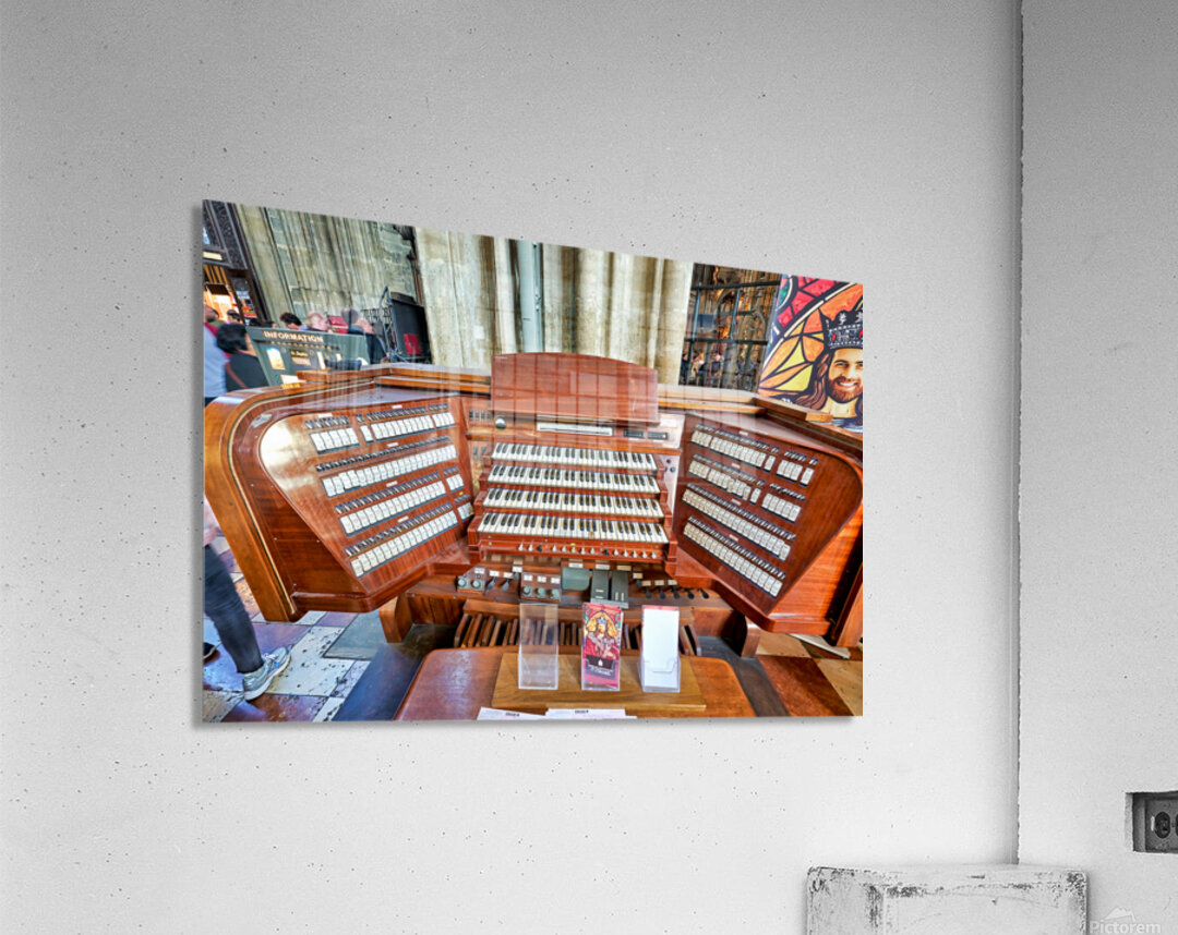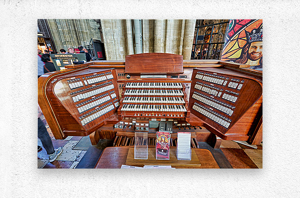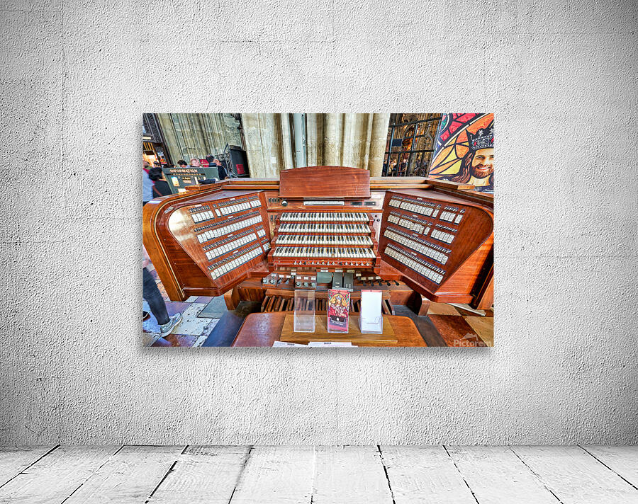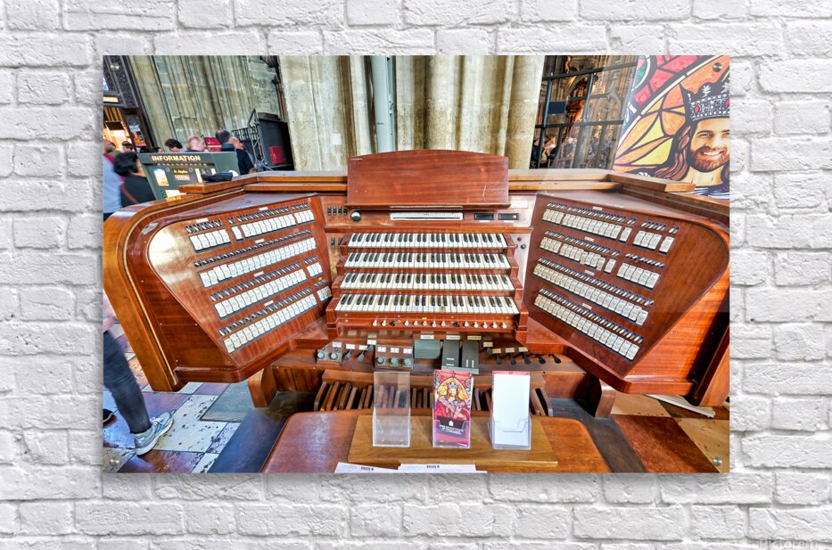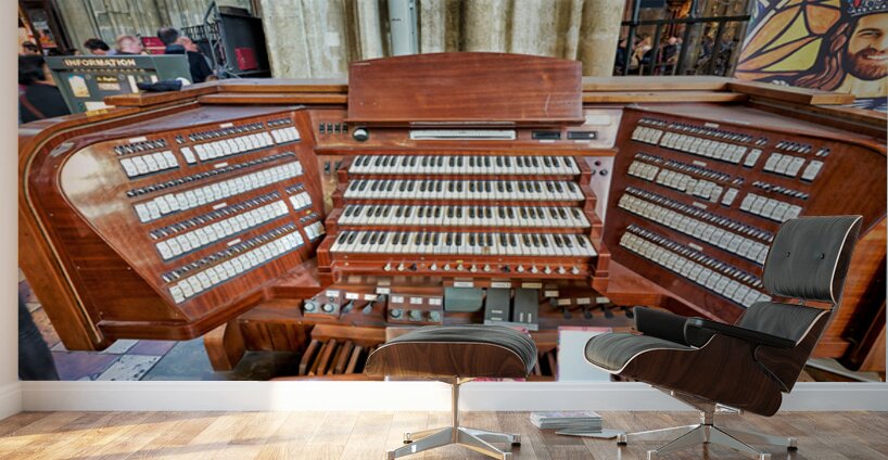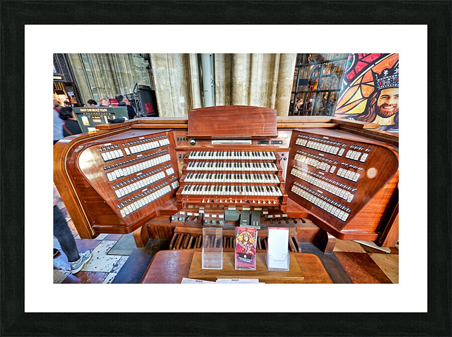 A grand pipe organ console in a cathedral likely St. Stephens in Vienna Austria with visitors and concert information for Mozarts Requiem.