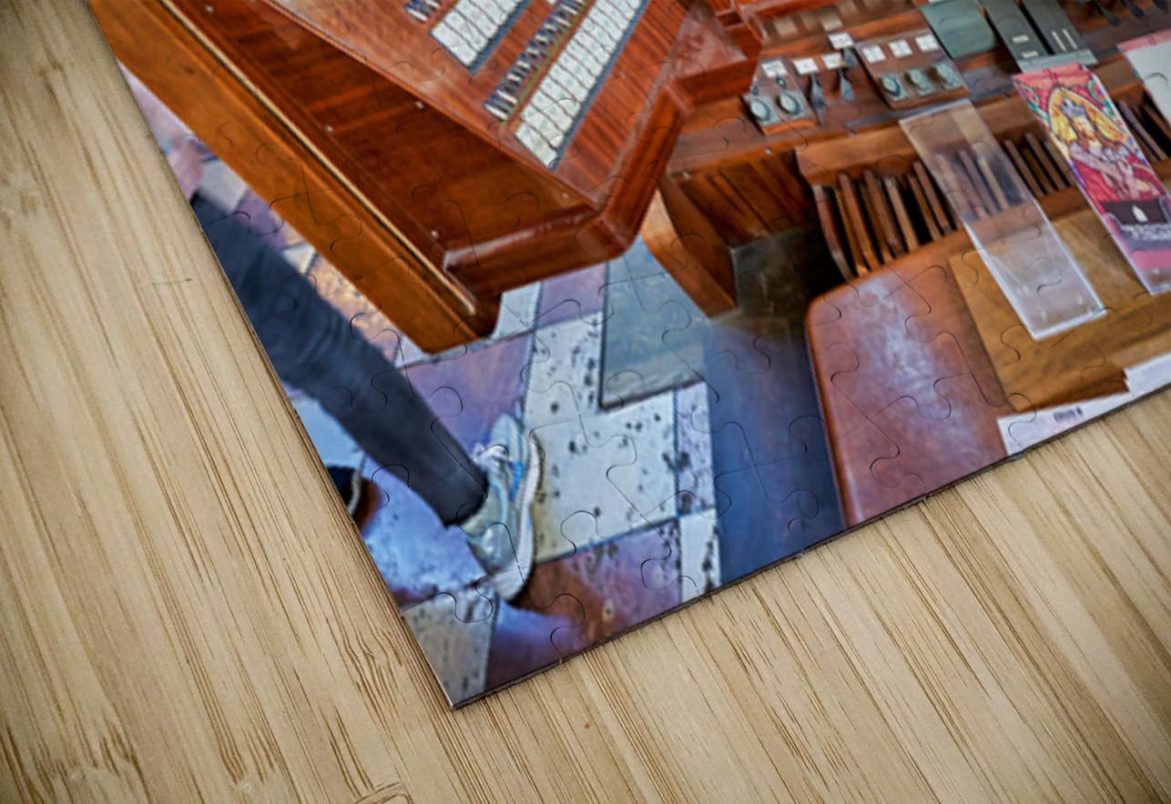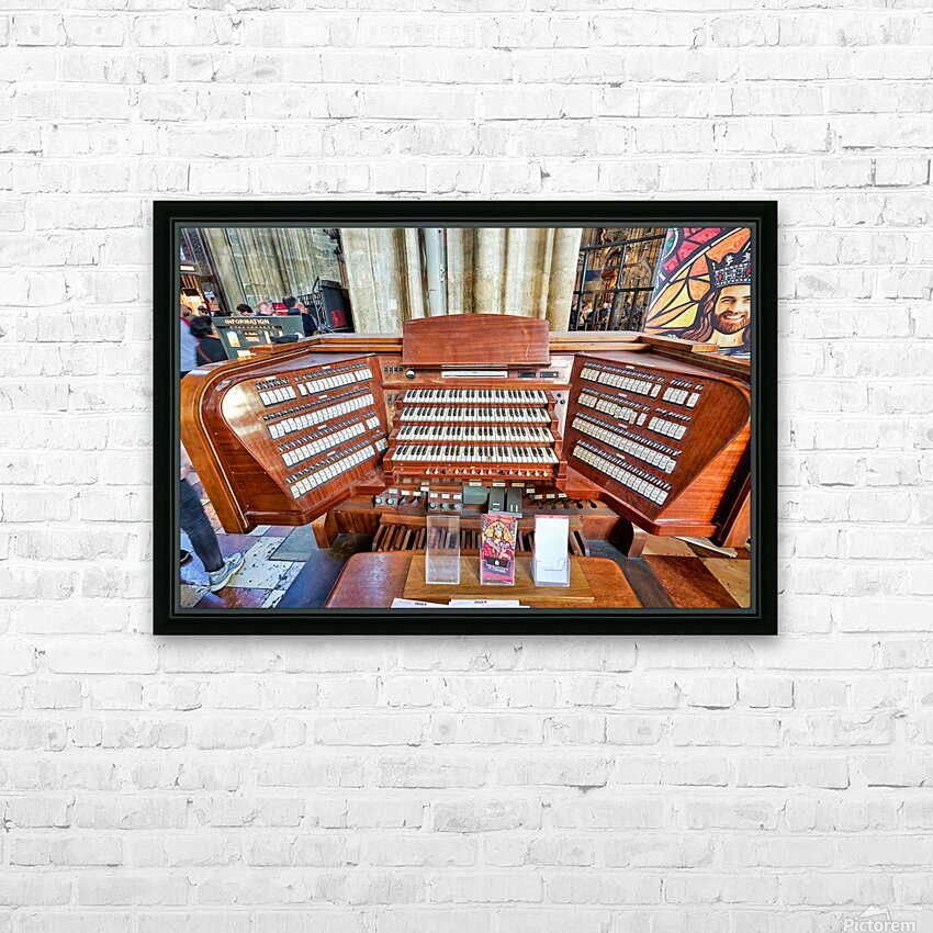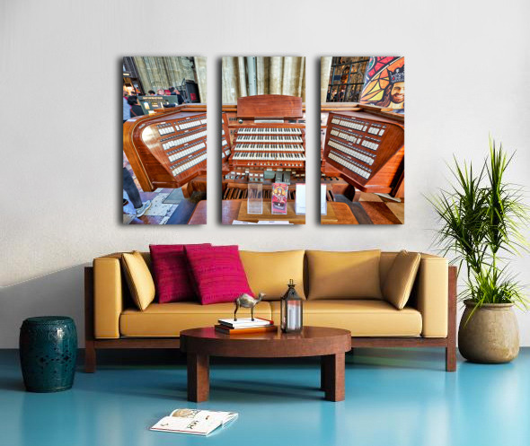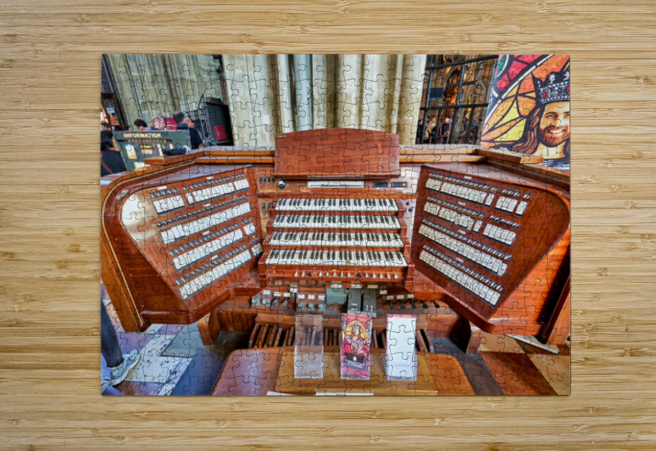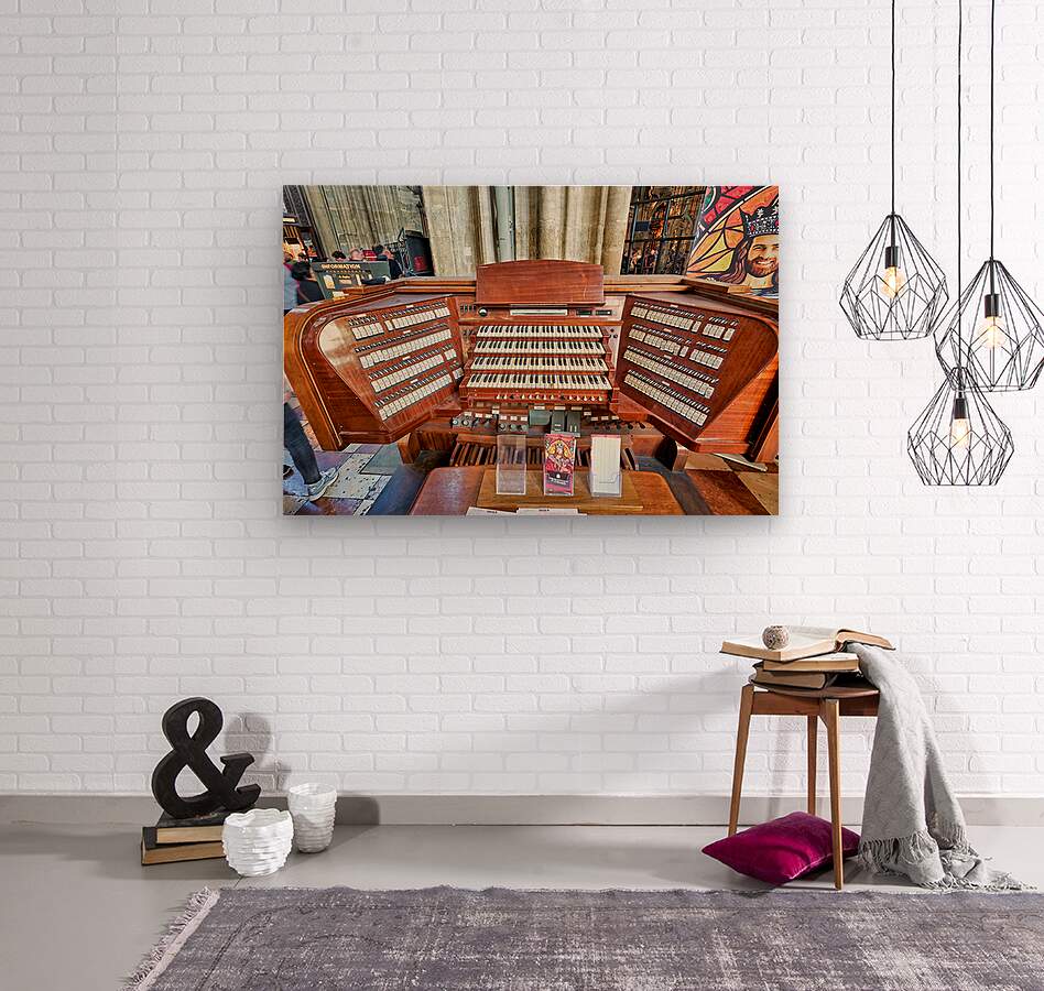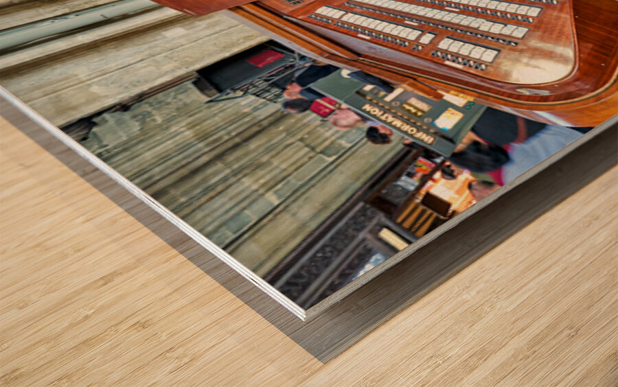 A grand pipe organ console in a cathedral likely St. Stephens in Vienna Austria with visitors and concert information for Mozarts Requiem.