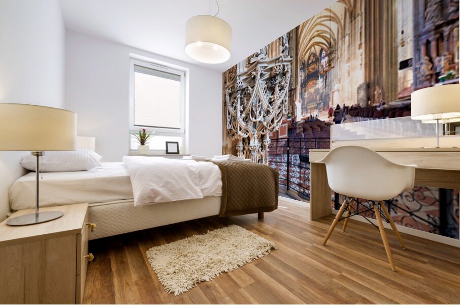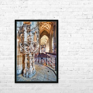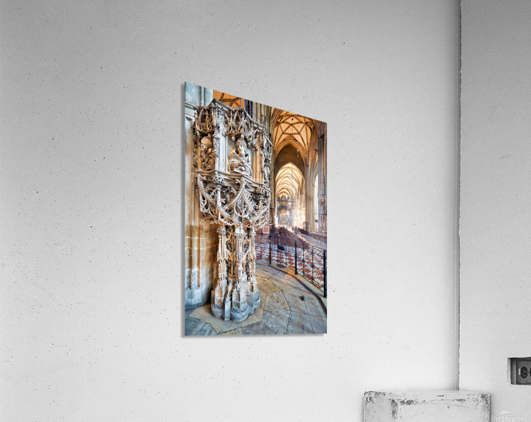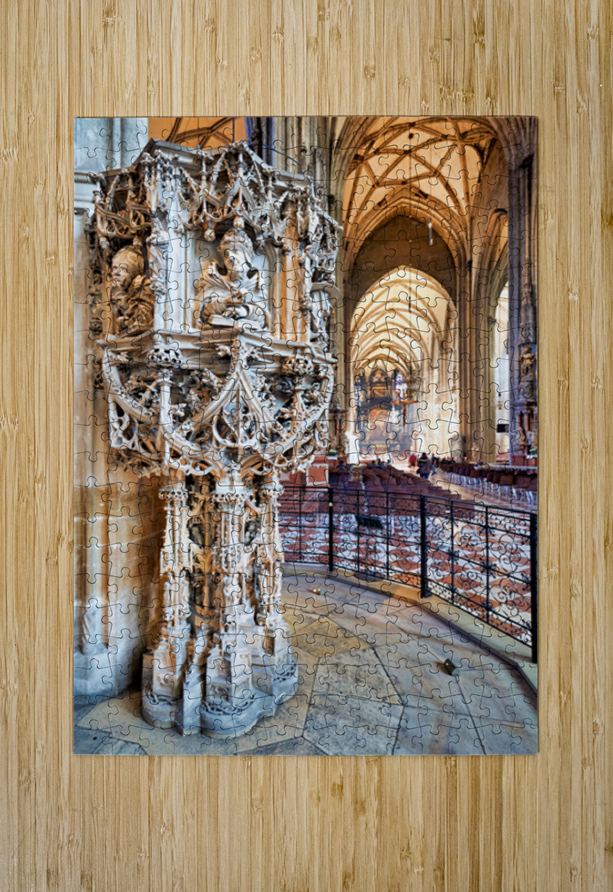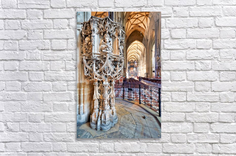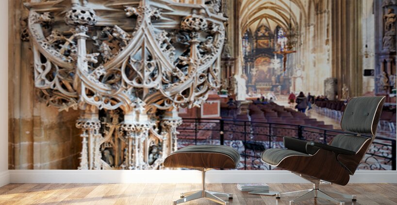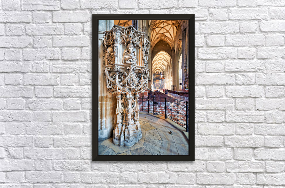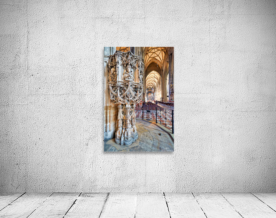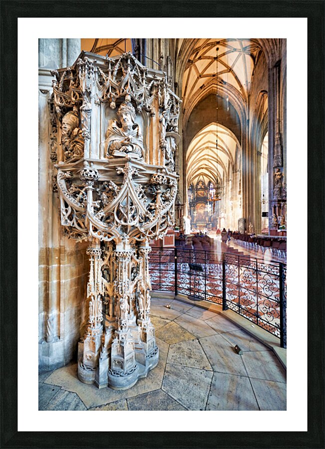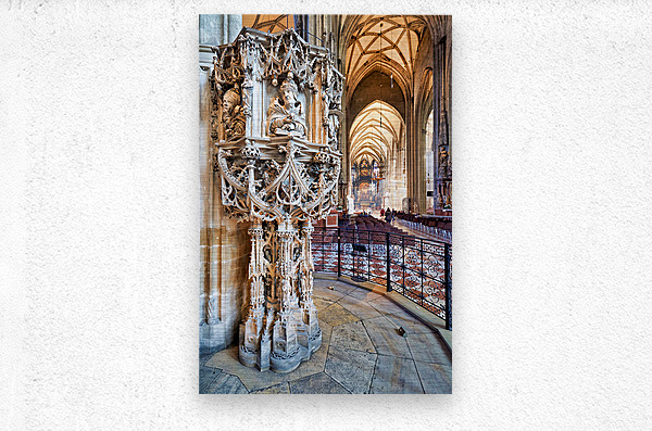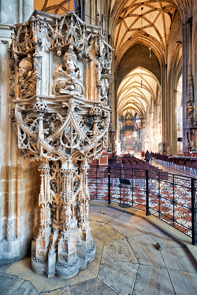 The ornate Gothic stone pulpit by Anton Pilgram inside St. Stephens Cathedral Vienna Austria showcasing intricate medieval craftsmanship for religious