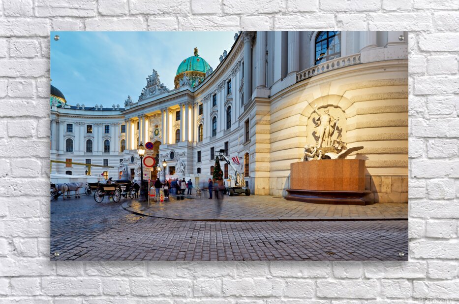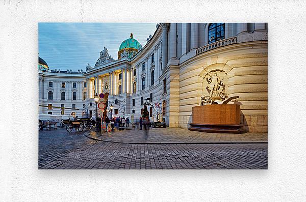 Get this artwork "Illuminated Hofburg Palace Vienna with people and horse carria" in a framed print.