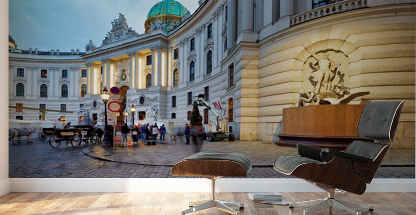 Evening at Hofburg Palace Vienna Austria. Pedestrians and horse-drawn carriages pass by as a Christmas tree is prepared creating a festive atmosphere.