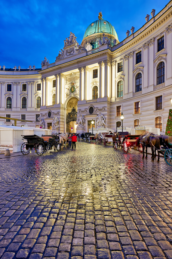 HOFBURG PALACE VIENNA AT NIGHT WITH HORSE DRAWN CARRIAGES.