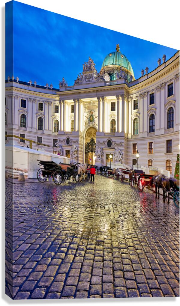 Get this artwork "Hofburg Palace Vienna at night with horse drawn carriages." in a framed print.