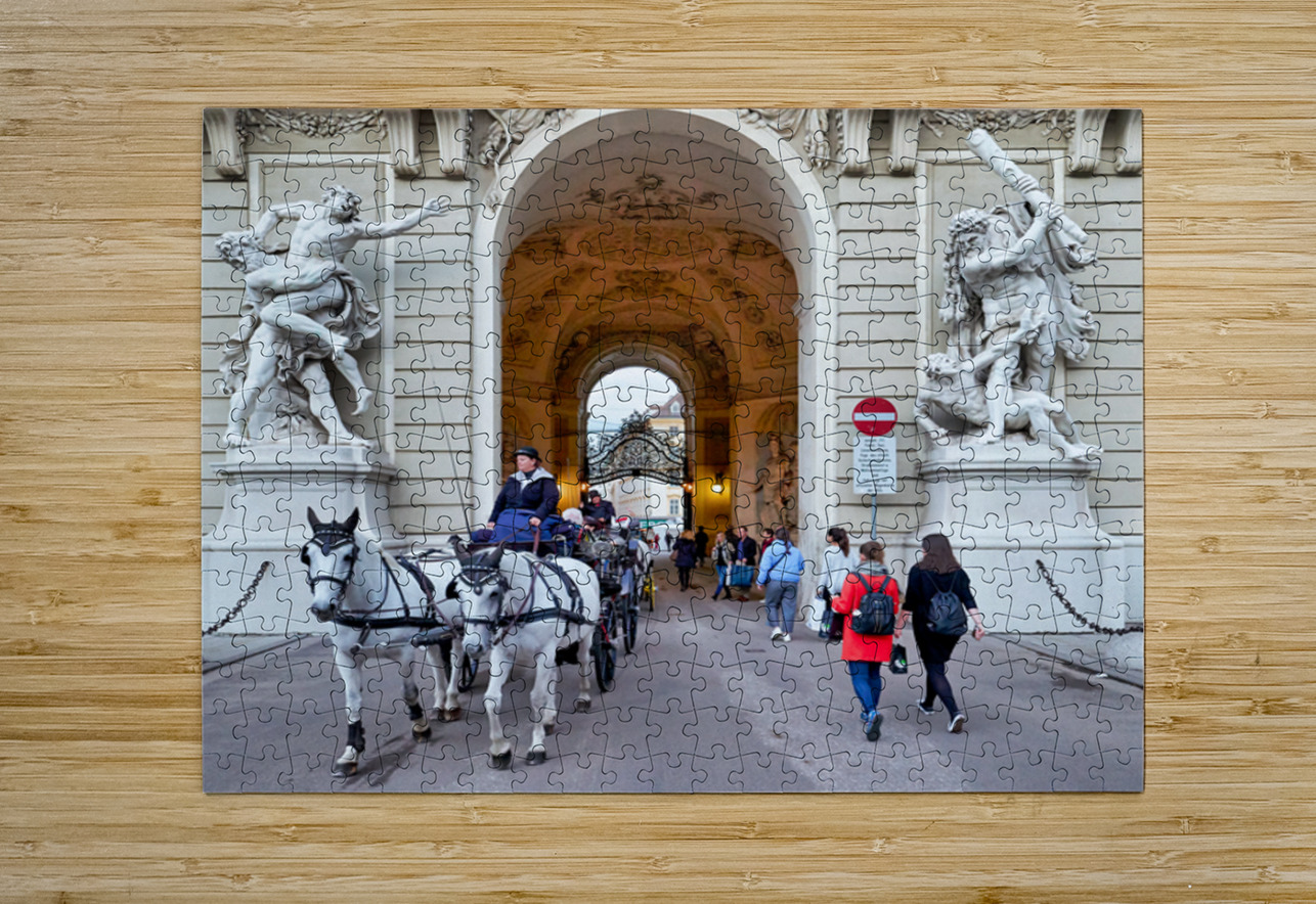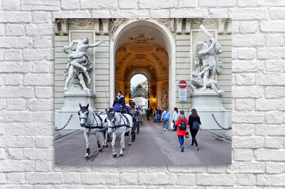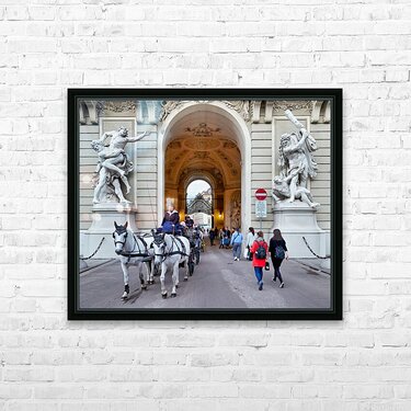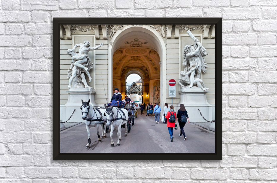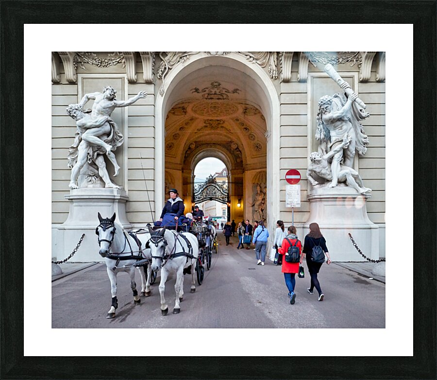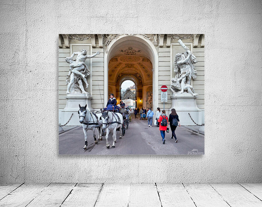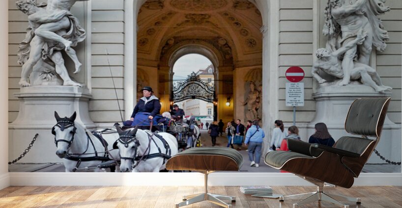 A Fiaker horse-drawn carriage with a coachman passes through a grand archway in Vienna Austria while tourists walk by enjoying the historic city.