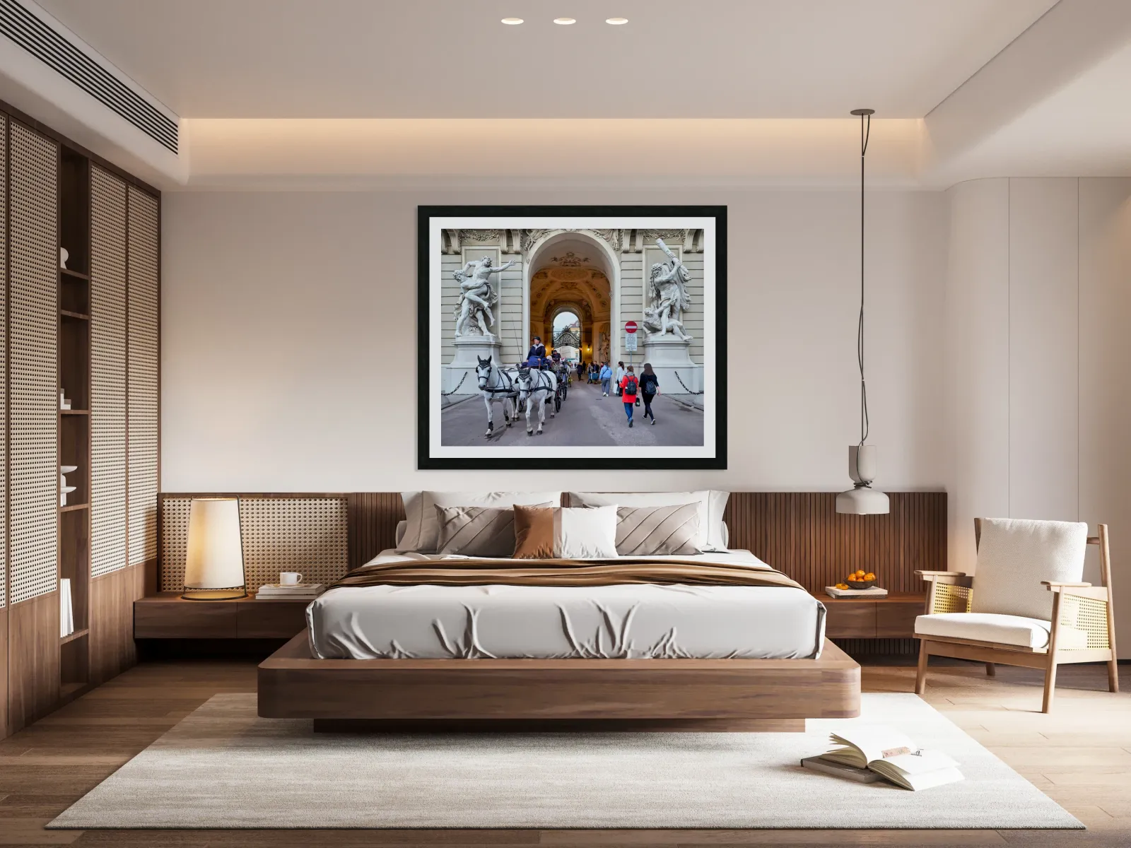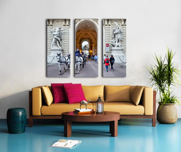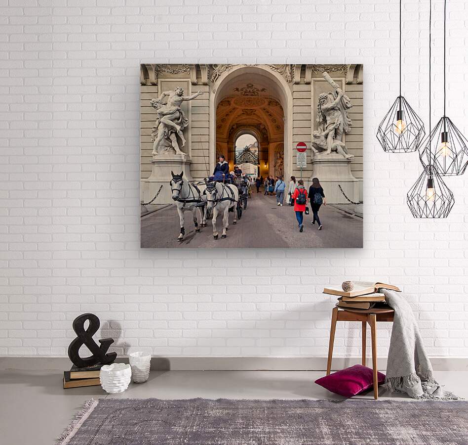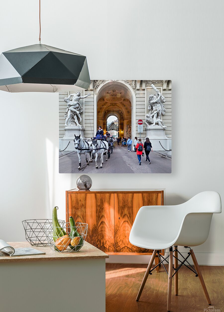 A Fiaker horse-drawn carriage with a coachman passes through a grand archway in Vienna Austria while tourists walk by enjoying the historic city.