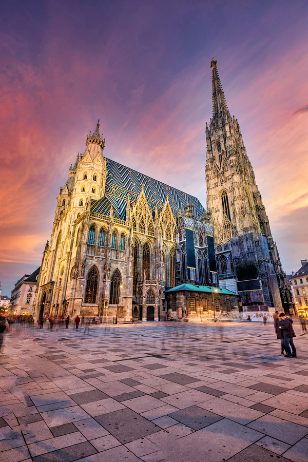 St. Stephens Cathedral in Vienna Austria glows under a vibrant sunset as people gather in the historic square appreciating the iconic architecture.