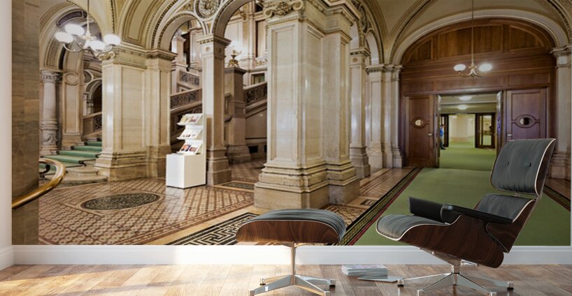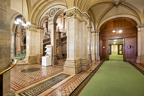 The opulent interior of the Vienna State Opera in Vienna Austria showcasing its grand staircase ornate arches and historic design for visitors.