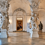 Visitors explore the ornate Sala Terrena at the Belvedere Palace in Vienna Austria admiring the grand architecture and statues or resting during their tour.